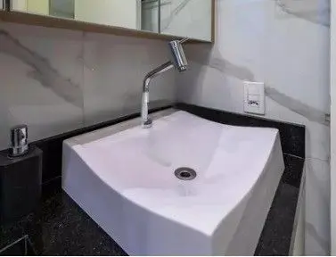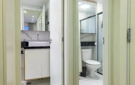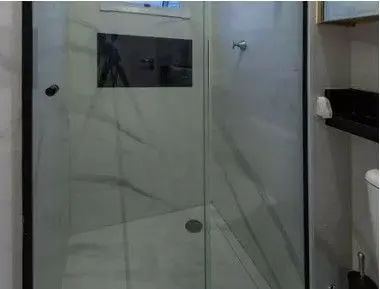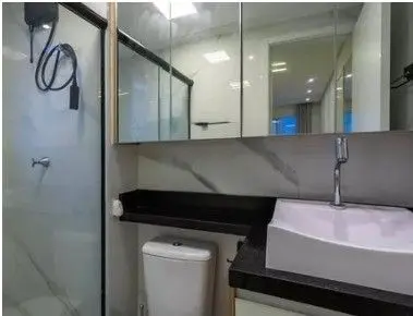 - Banheiro Moderno equipado com ducha, box de vidro e armário.