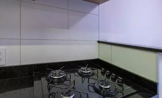 - Cozinha rica em armários planejados, equipada com geladeira, cooktop, micro-ondas e máquina de lavar.