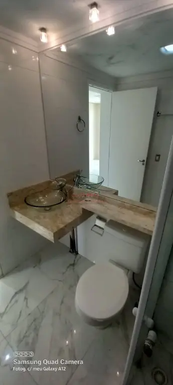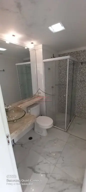 - BANHEIRO SOCIAL TODO DE PORCELANATO, PORTA DE MADEIRA, BOX DE CANTO DE VIDRO, PAREDE COM AZULEJO DECORATIVO, LAVATÓRIO DE MÁRMORE COM PIA DE VIDRO, ESPELHO COLADO, ESPAÇO PARA INSTALAÇÃO DE MÁQUINA DE LAVAR ROUPAS.