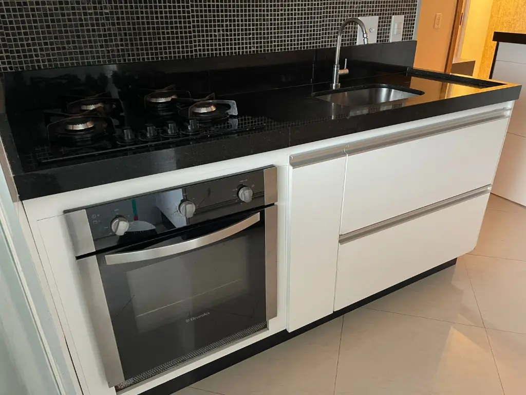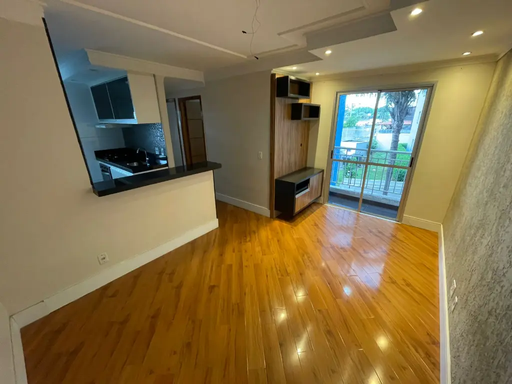 O imóvel possui: 2 dormitórios, sala, cozinha com fogão e forno, 1 banheiro, área de serviço, varanda na sala e 1 vaga de garagem. Área útil de aproximadamente 52m²