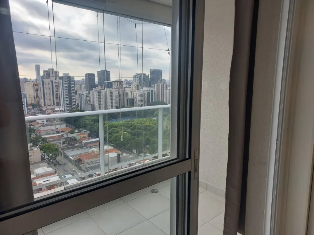 Varanda espaçosa com ampla vista panorâmica em andar alto.