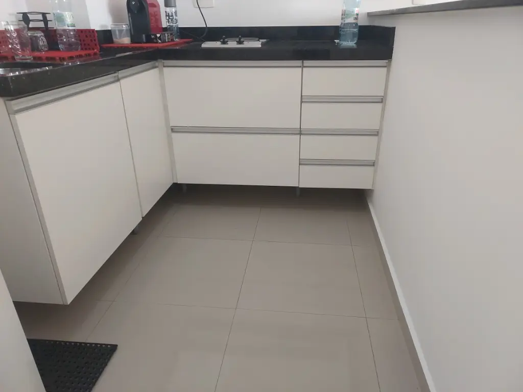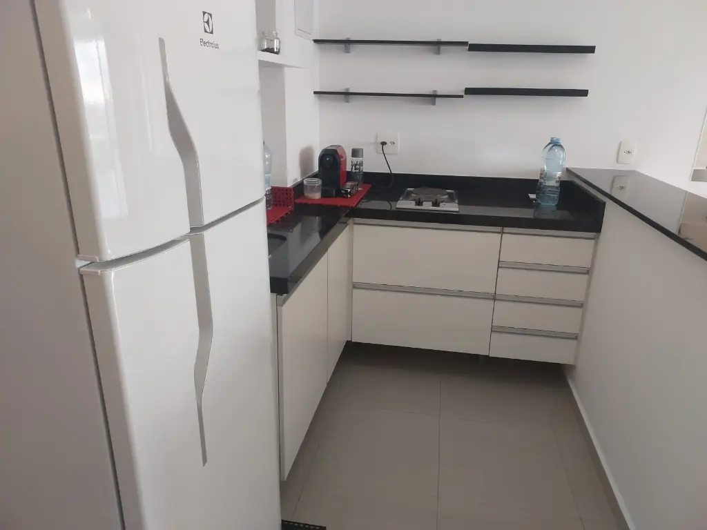 cozinha, geladeira, sofá, colchão, banheiro com armários e box blindex.