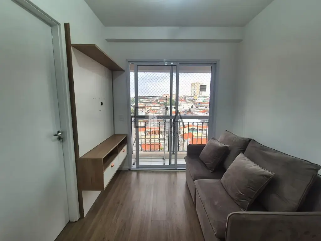 A sala é funcional e mobiliada, com sofá, mesa e rack para televisão, perfeita para momentos de descanso e convivência. O apartamento possui ainda sacada, trazendo mais ventilação e iluminação natural.