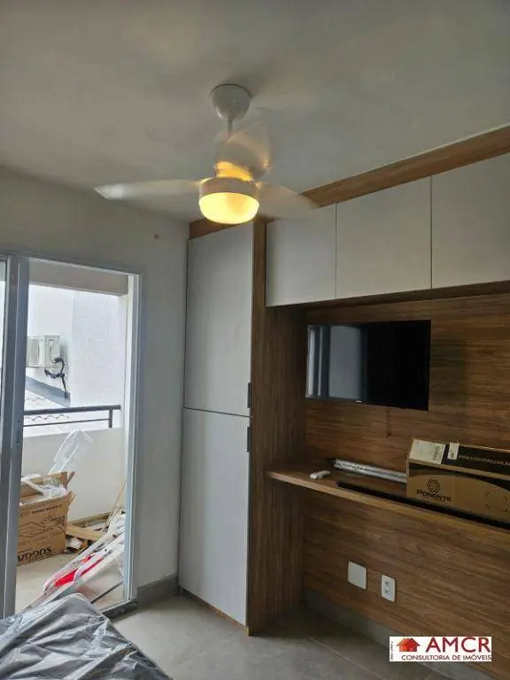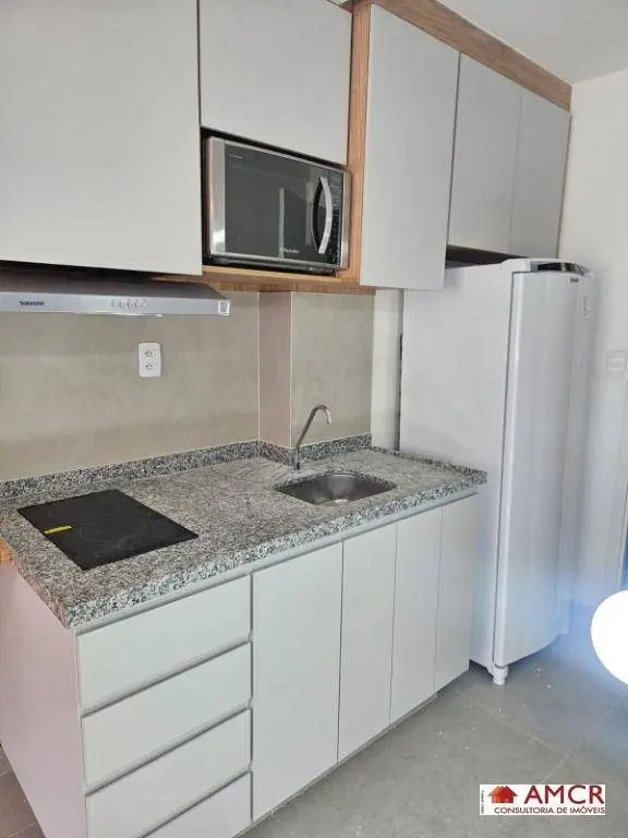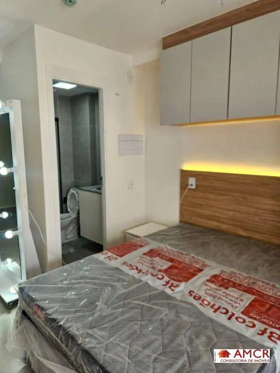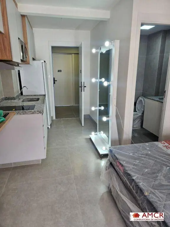 Studio 25m²: Design moderno e aproveitamento total do espaço, móveis planejados, totalmente mobiliado.