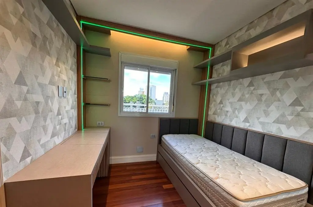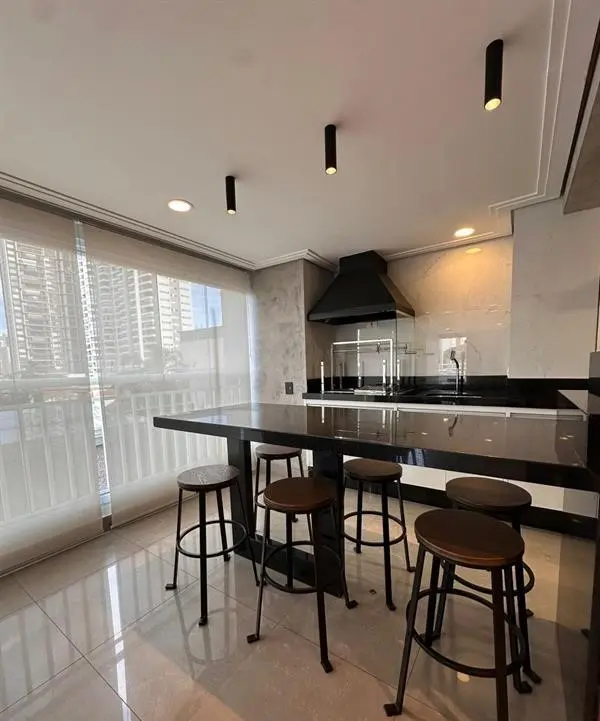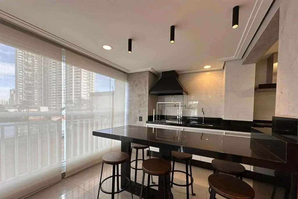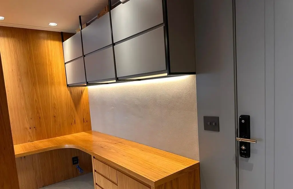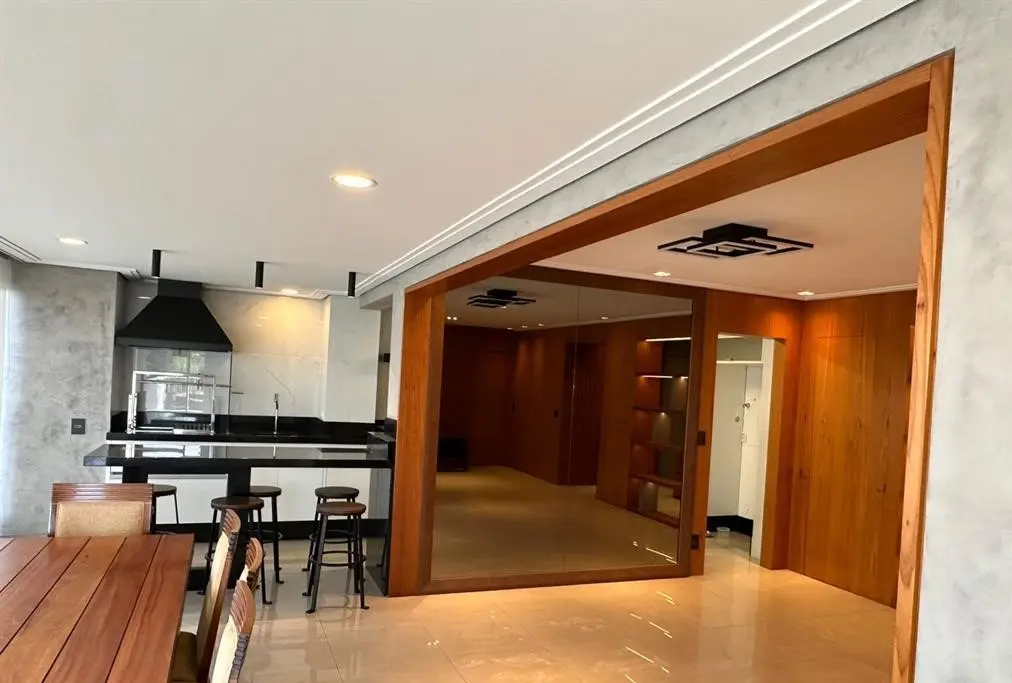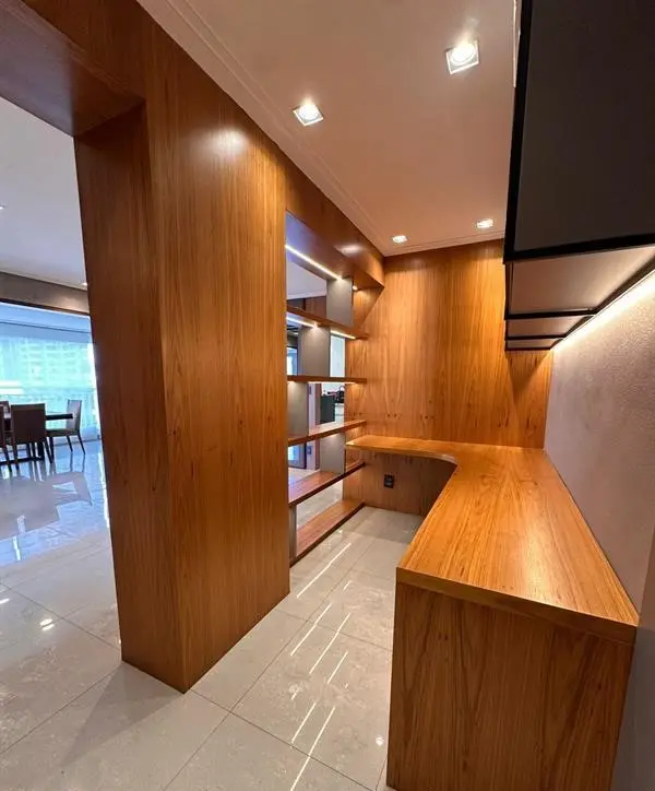 Apartamento com 3 dormitórios sendo 3 suítes, área gourmet, Garden, sala com varanda ampliada, sol da manhã na sala e suíte principal e sol da tarde nas duas outras suítes, ventilado e iluminado, com marcenaria em todos os cômodos, paredes da sala, escritório e lavabo com madeira natural, além de contar com 3 vagas de garagem.