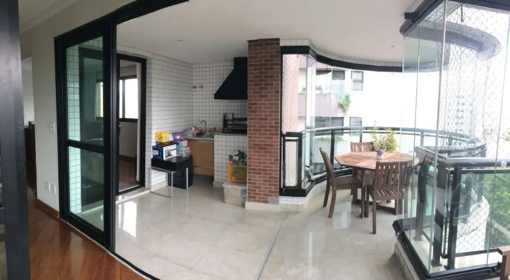Espaço para 3 ambientes com piso de assoalho de madeira, integrado a um terraço gourmet com churrasqueira e fechamento de vidro. Aprecie uma linda vista para a praça, em um ambiente ensolarado.