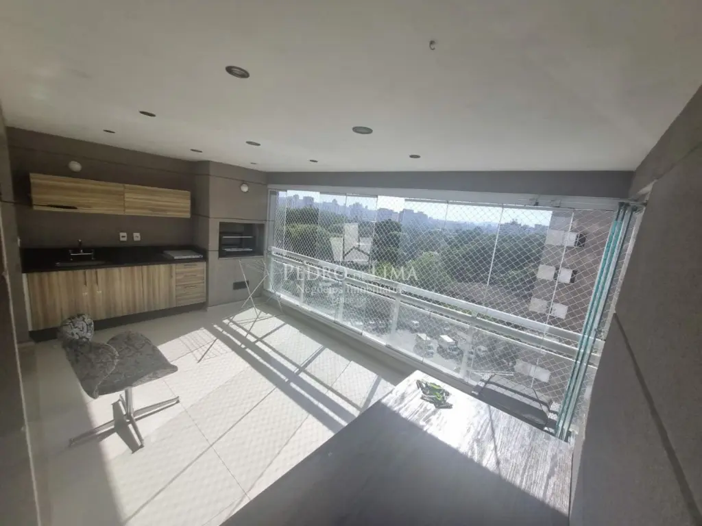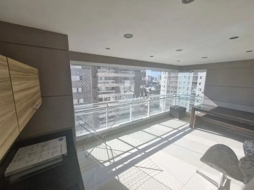 Apartamento em andar alto, planta com 124m², 3 suítes, sala para dois ambientes, varanda gourmet com churrasqueira a carvão e fechamento em vidros, cozinha americana, lavanderia e 2 vagas de garagem + depósito privativo. Repleto em planejados.