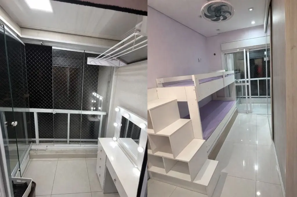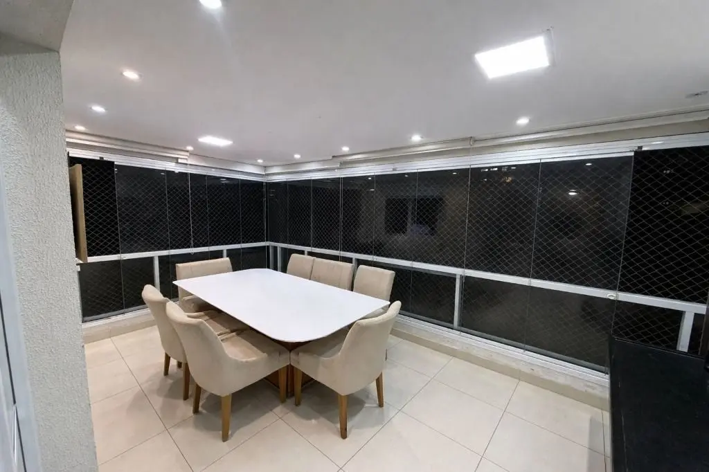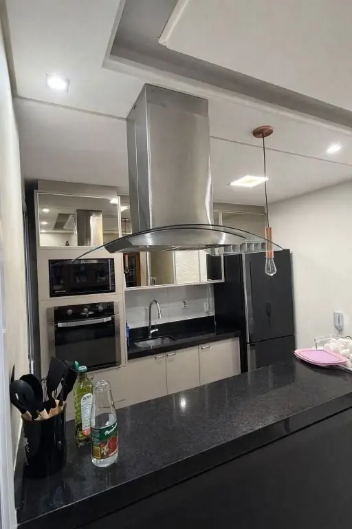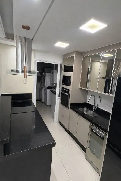 3 banheiros, 2 varandas, cozinha planejada com ilha centralizada em granito preto, coifa central, forno e microondas embutidos, teto em gesso, piso em porcelanato crema, cozinha integrada ao terraço e a sala, área de serviço com aquecedor a gás, dormitórios planejados ricos em armários, terraqço com fechamento em vidro e persianas blackout, banheiros com pastilhas, pia em cuba sobreposta, box de vidro com nicho, gabinetes, espelhos, porcelanato e teto com gesso, apartamento todo em porcelanato.
