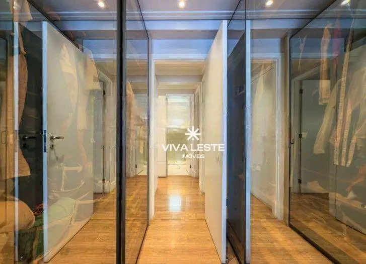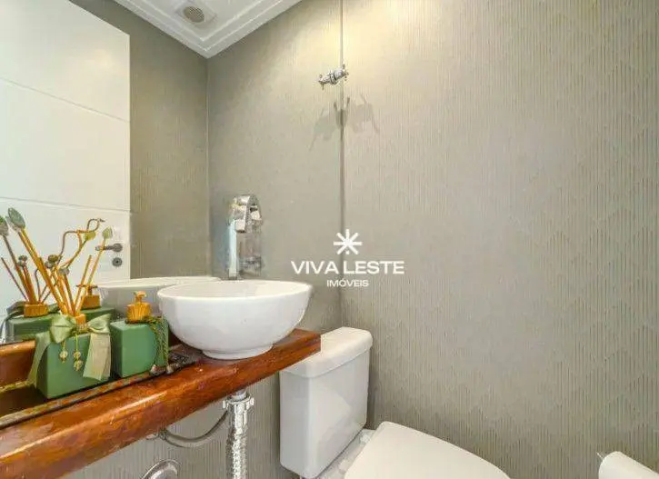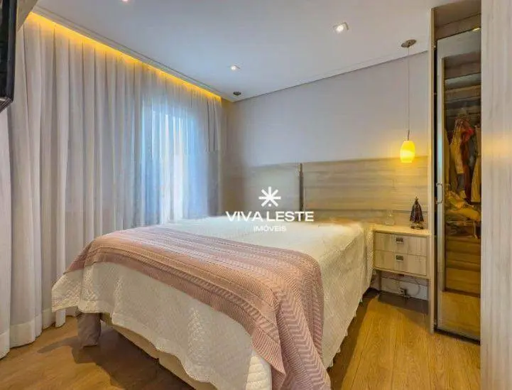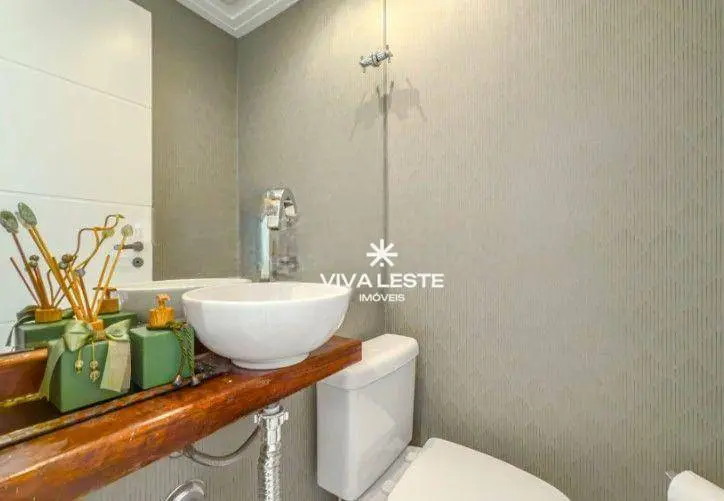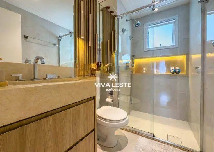 A área íntima conta com móveis planejados de alto padrão, com destaque para a suíte decorada com painel ripado e banheiro com pia esculpida em granito.