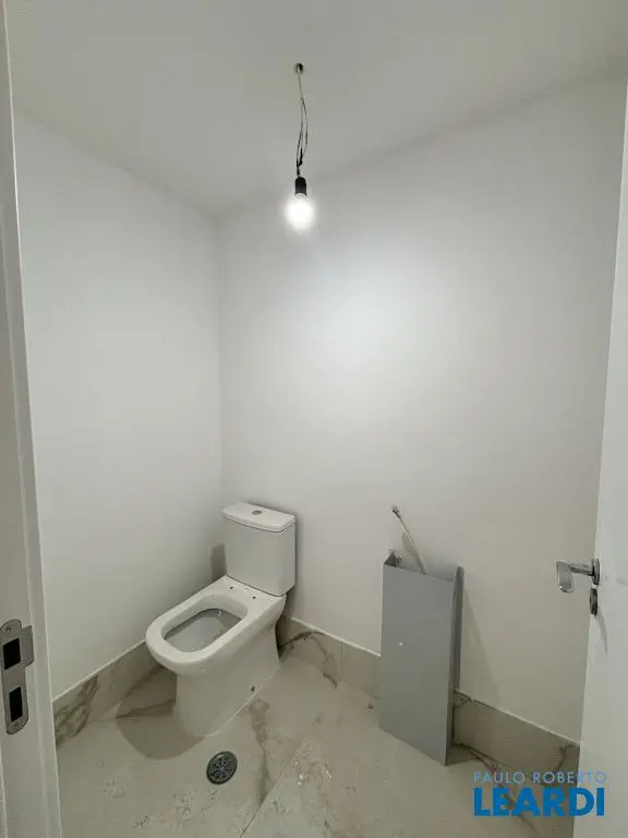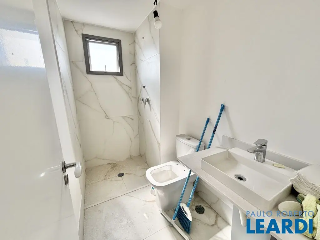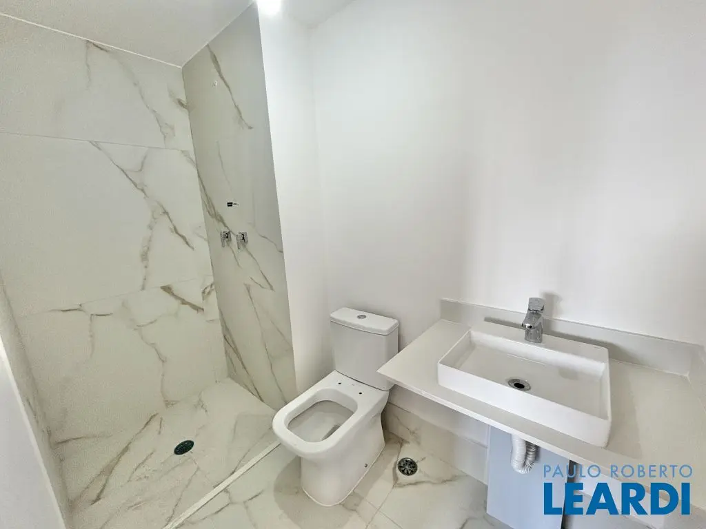 Banheiros e lavabo todos em porcelanato Oro Bianco, pia e torneiras instalados.