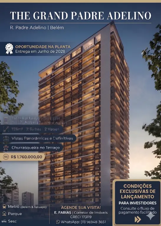 Descubra a sofisticação de viver no The Grand Padre Adelino. Uma torre exclusiva com plantas de 125m², 3 suítes e o privilégio de um lazer completo no 32º pavimento, com vista panorâmica para São Paulo.