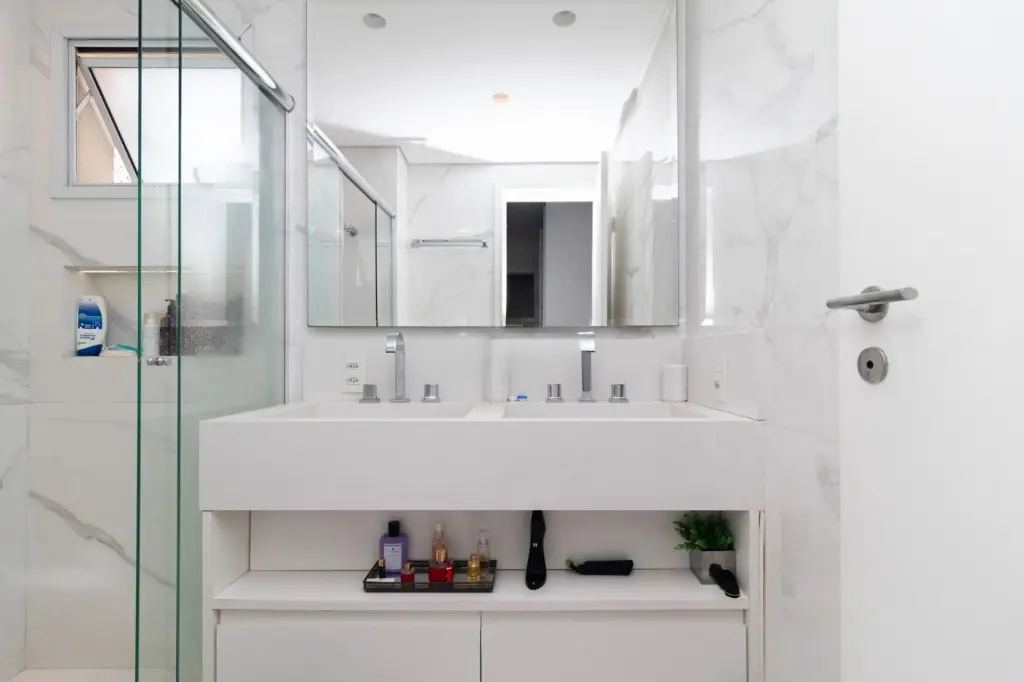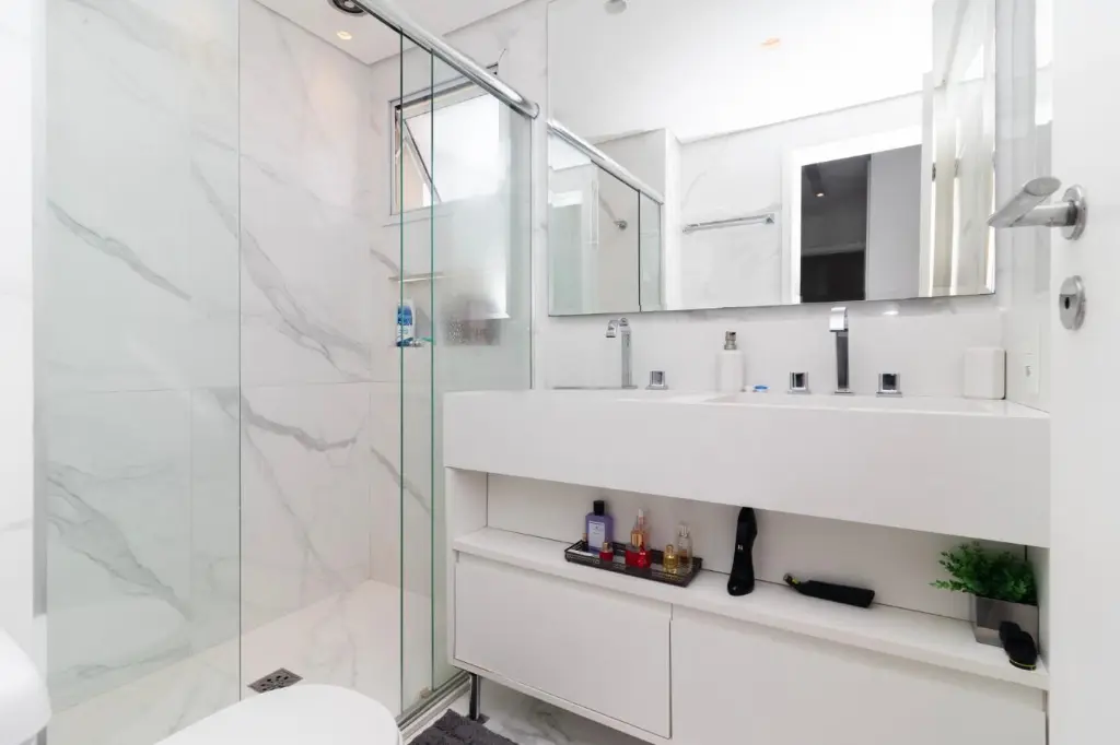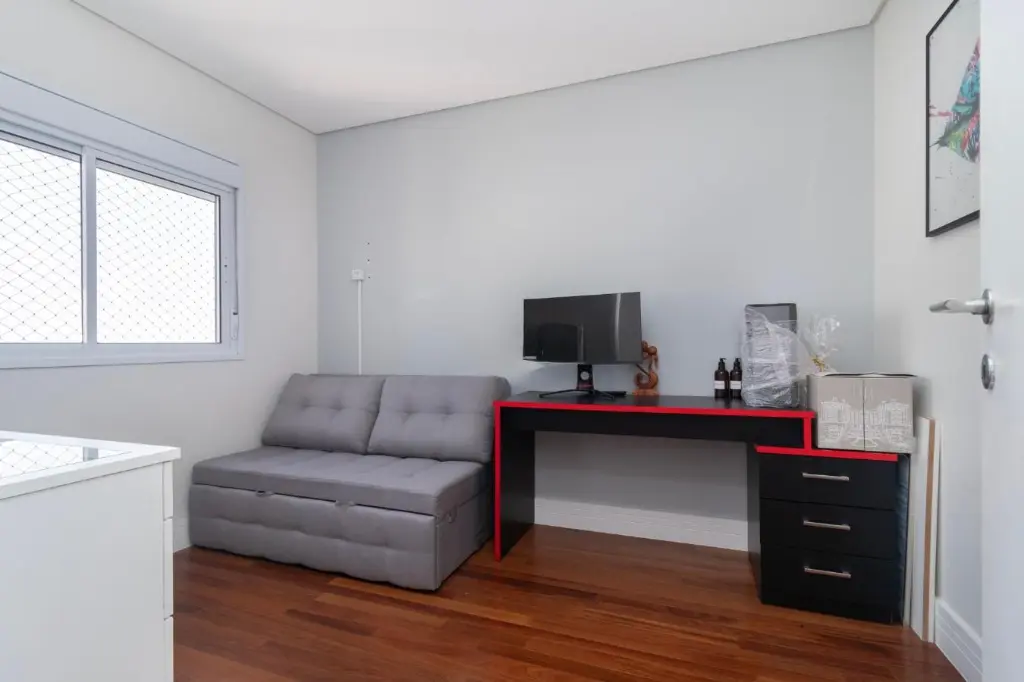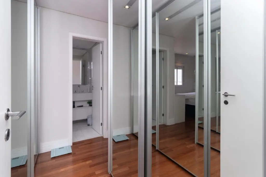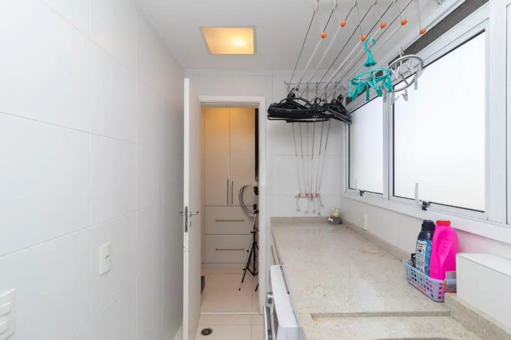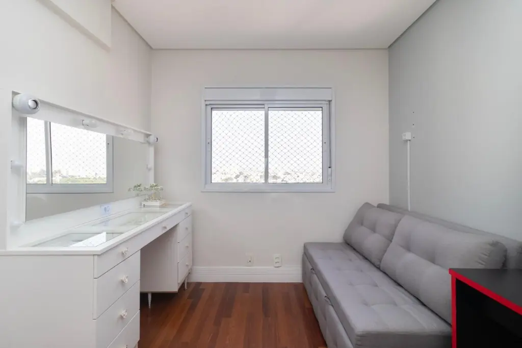 A suíte principal é um verdadeiro refúgio, apresentando espaço amplo, com 2 chuveiros e 2 pias, e uma vista deslumbrante para o parque. A verdadeira joia deste apartamento é a varanda espaçosa, onde você pode desfrutar de momentos