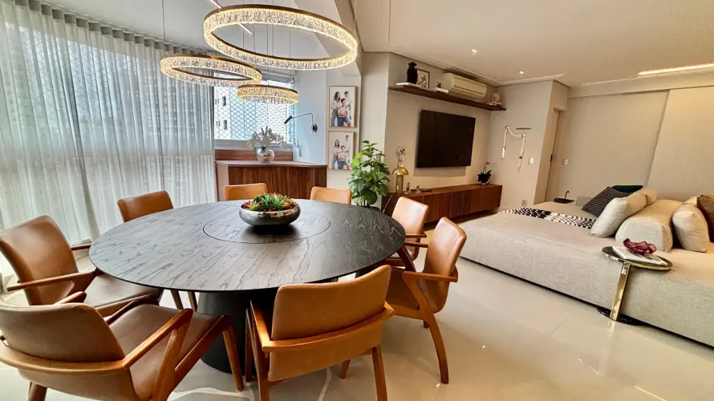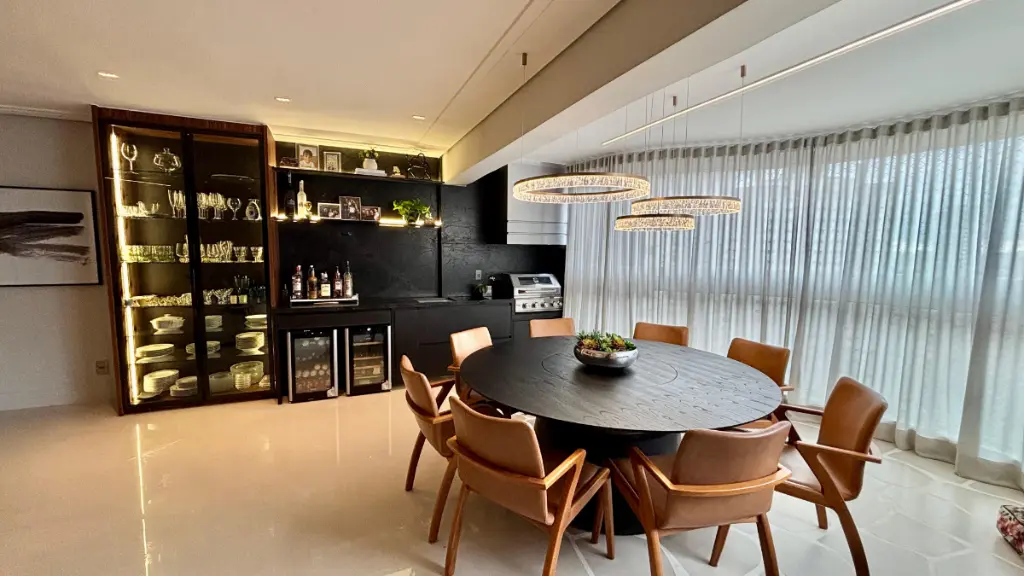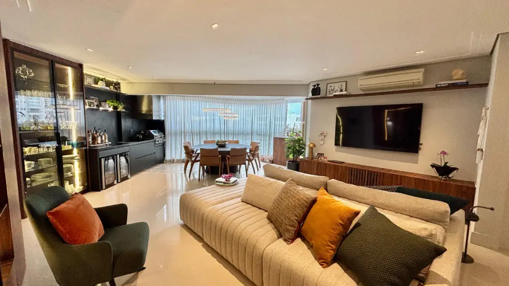 Ambientes amplos e iluminados, integrando sala de estar, jantar e varanda gourmet