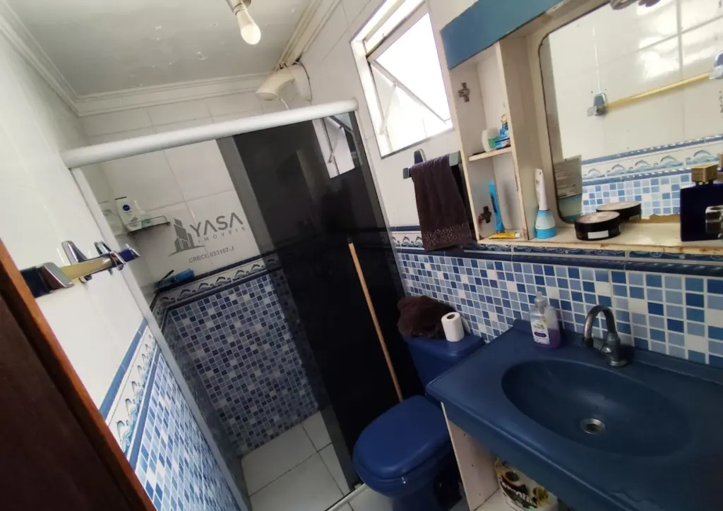 Banheiro social com box e móveis