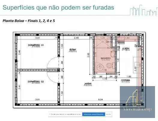2 dormitórios, sala, cozinha, área de serviço e 1 banheiro social.