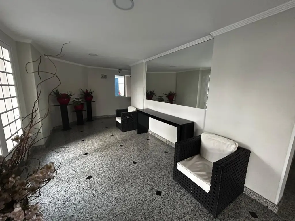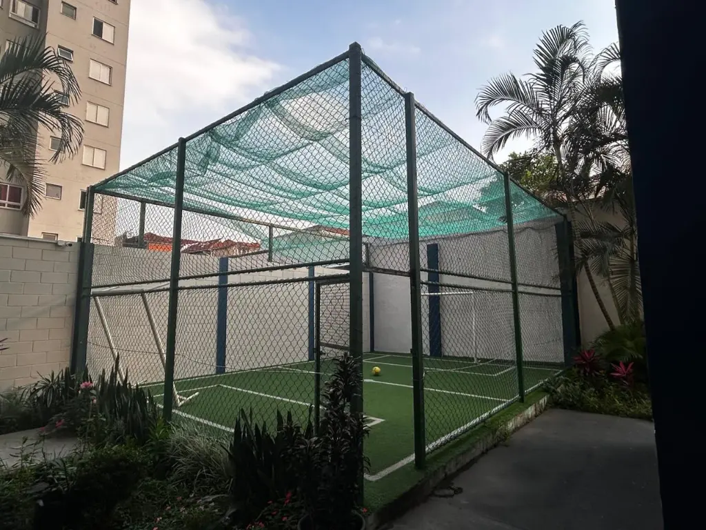 O condomínio contém: Portaria 24 horas, elevador, quadra esportiva e salão de festa,