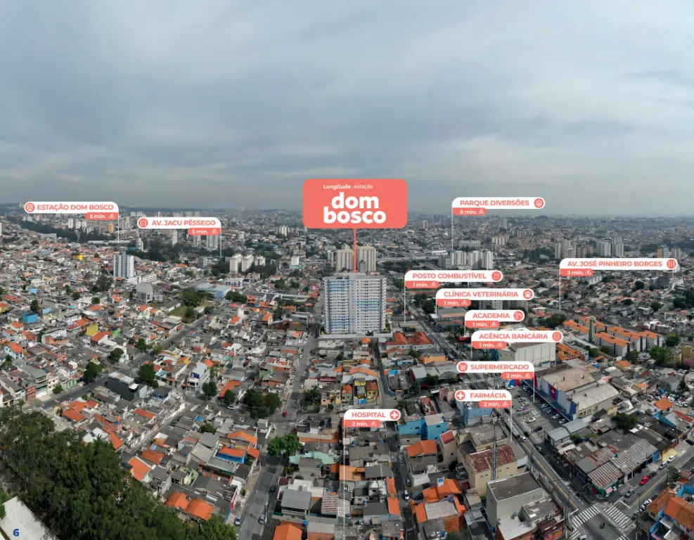 Viva em um empreendimento moderno, bem localizado e com tudo o que você precisa ao redor. O Dom Bosco, da Longitude, está localizado na Rua Dona Maria de Camargo, 234 - Itaquera, a poucos minutos da Estação Dom Bosco (CPTM - Linha 11 Coral) e com fácil acesso às principais vias da Zona Leste, como a Avenida Jacu Pêssego e a Avenida José Pinheiro Borges.