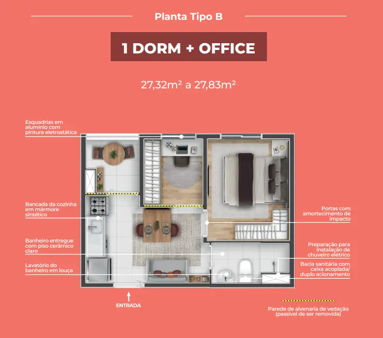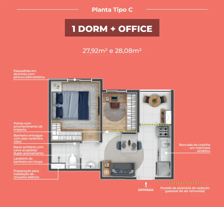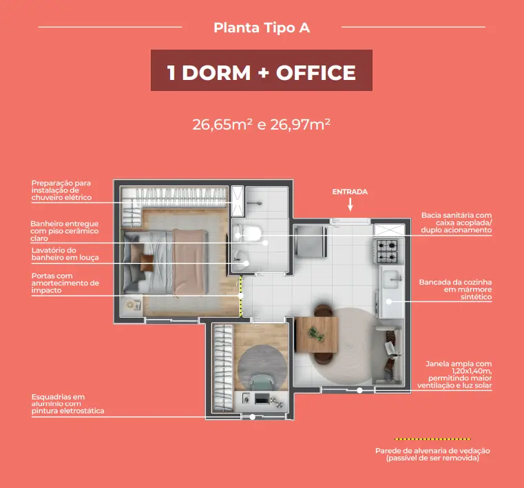 Os apartamentos seguem o conceito Multidorm, com plantas inteligentes e versáteis que se adaptam ao seu momento de vida. O cômodo extra pode ser usado como home office, closet, ateliê ou espaço multifuncional, conforme a sua necessidade.