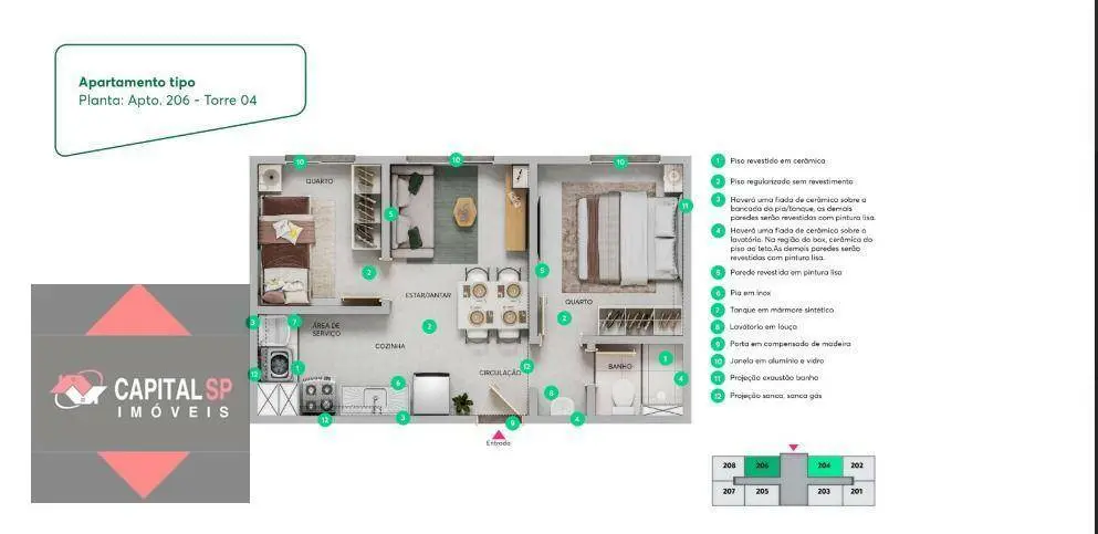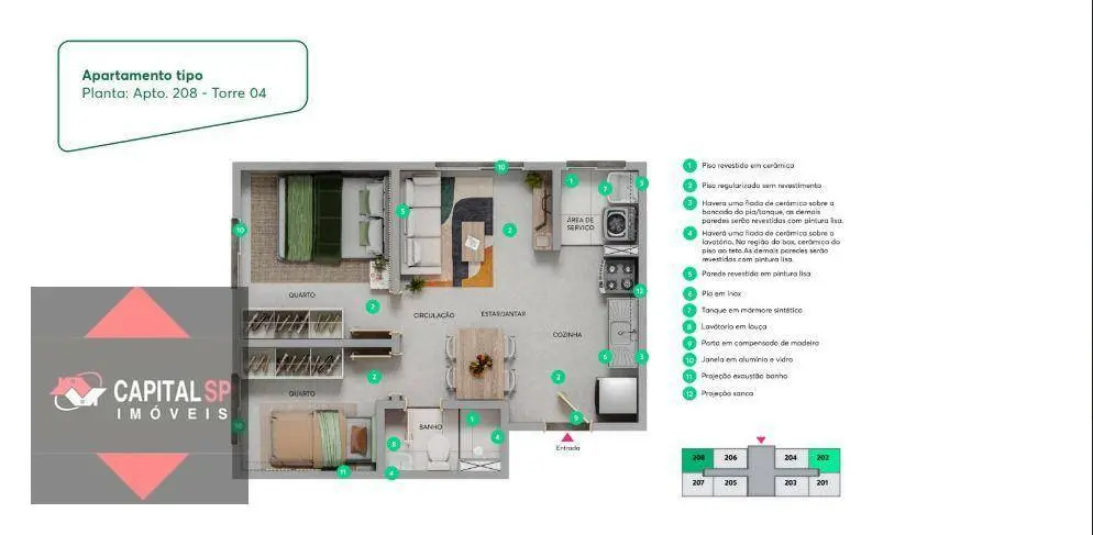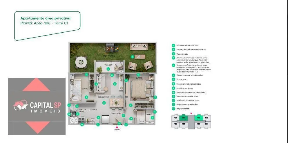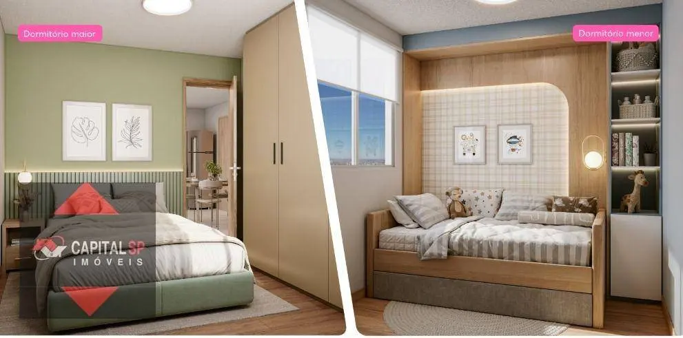 Os apartamentos possuem 2 dormitórios, com metragens que variam entre 33,72 m² e 35,33 m², além de opções com varanda de 36,48 m² a 38,37 m², trazendo mais ventilação e qualidade de vida para o seu dia a dia. Também há unidade adaptada para PCD com varanda. Algumas unidades contam ainda com área privativa acessória, que varia aproximadamente de 8,37 m² a 17,60 m².