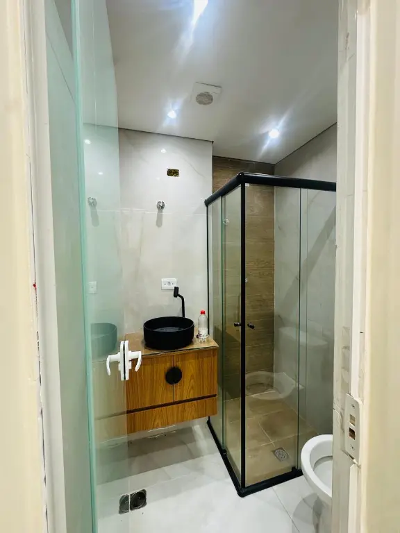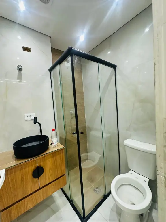 Banheiro Pronto: Já entregue com box de vidro e armário, pronto para o uso.