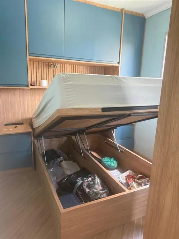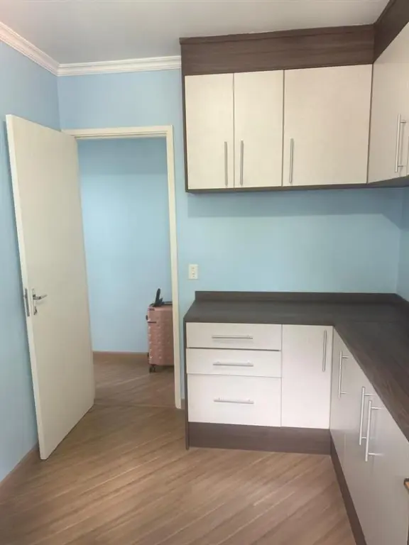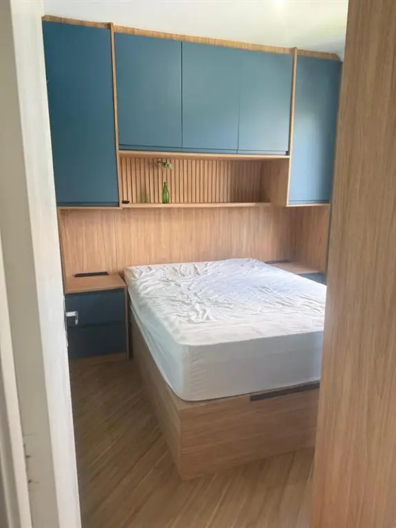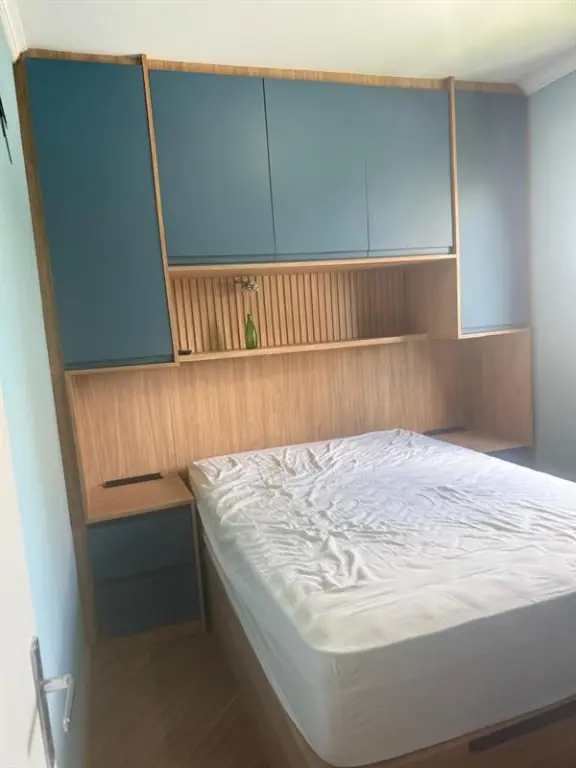 Apartamento de 47m² bem distribuídos, com 2 dormitórios, varanda, piso de madeira, gás encanado e móveis planejados novos na cozinha, quartos e banheiro, além de 1 vaga de garagem.