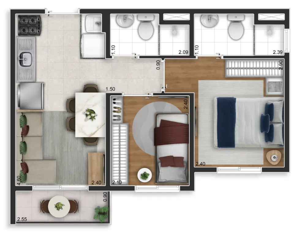 As plantas trazem acabamento de qualidade: piso laminado nos dormitórios, infraestrutura para ar-condicionado, medição individual de água e gás etc.