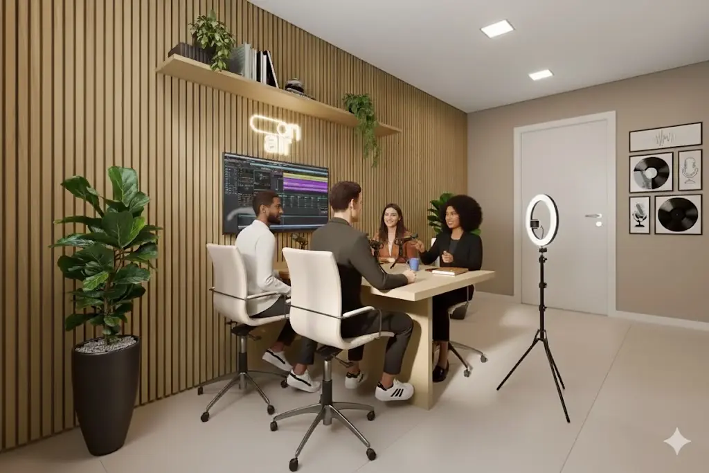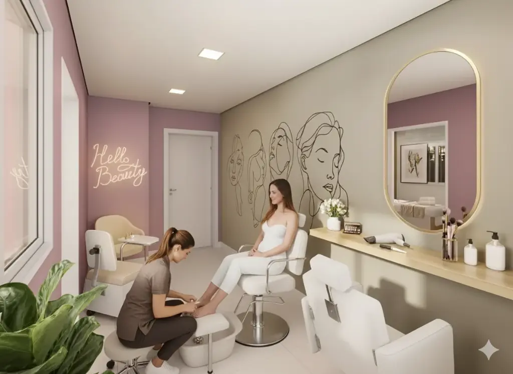 Salão de festas gourmet, salão de jogos, brinquedoteca, estúdio, espaço beleza.