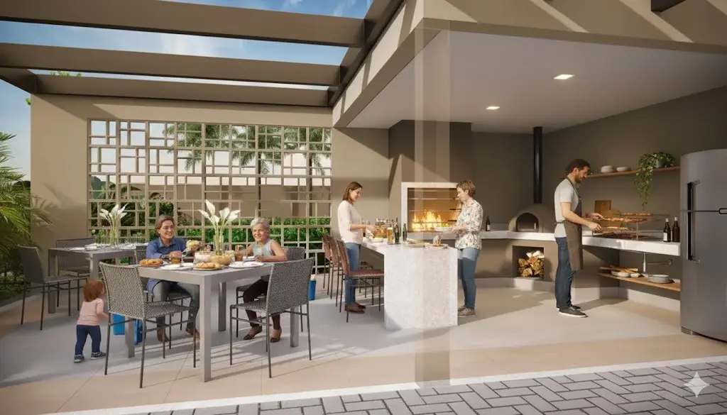 Bicicletário; praças de convívio; playground; áreas de churrasqueira e churrasqueira gourmet; lounge com lareira.