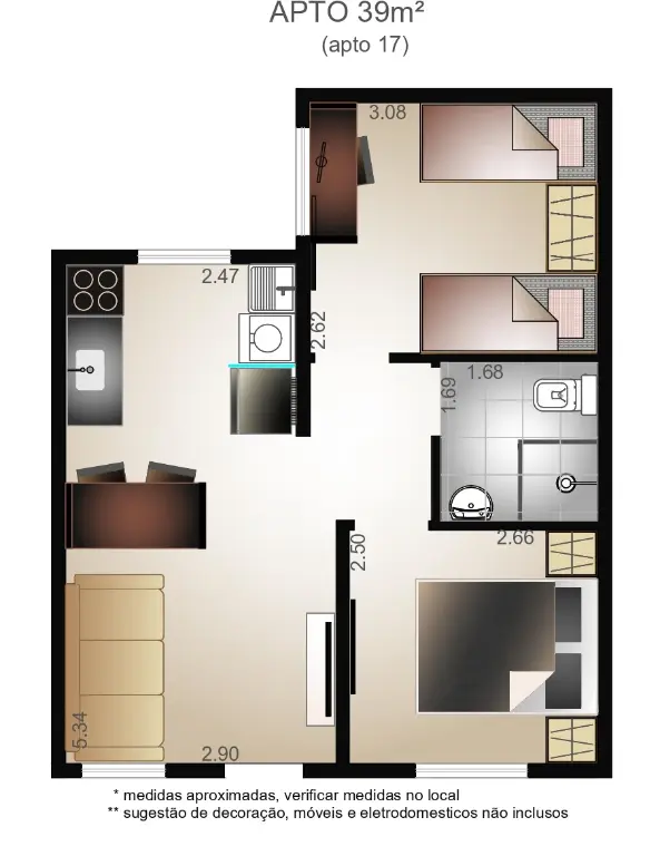 Apartamento novo de 39m² (sem vaga)- 2 dormitórios, sala, cozinha, banheiro social e área de serviço externa com excelente acabamento. Região com comércio aquecidissímo, próximo à Av Sapopemba e de fácil acesso ao transporte público com as novas estações de metro linha verde estaçãoes Santa Clara e Anália Franco.