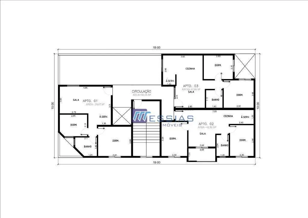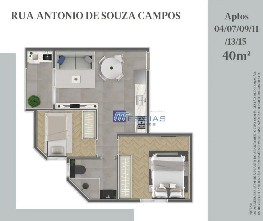 Excepcional projeto / Apartamento com ampla sala para 2 ambientes; cozinha com pia e bancada em granito e área de serviço; banheiro social, dormitório solteiro e dormitório casala