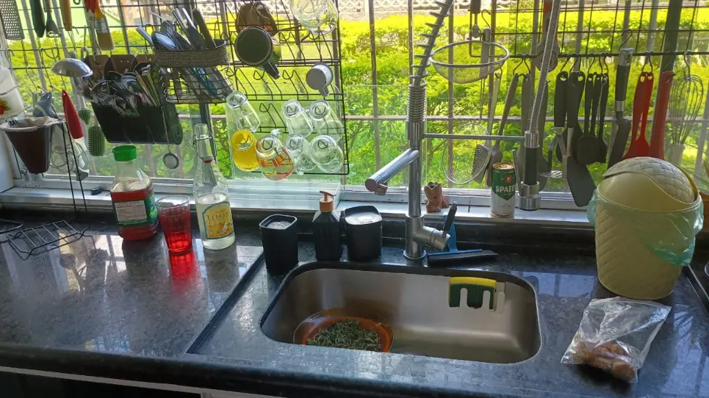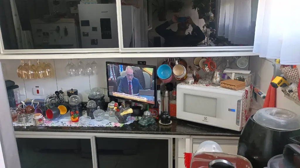 Cozinha ampliada com armário, balcão de vidro e área de serviço