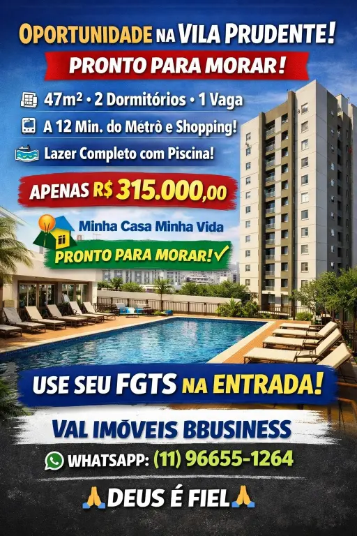 **OPORTUNIDADE ÚNICA - MINHA CASA MINHA GANHE NA COMPRA DO SEU APARTAMENTO UM JANTAR NA PADARIA CEPAM GARANTA SEU VOUCHER **PROCURE POR VAL IMÓVEIS BBUSINESS** APARTAMENTO 2 dormitórios com 1 vaga Apenas: 315.000,00 Entrada 30.000,00 FGTS 35.000,00 * **Lazer completo**: piscina, quadra, churrasqueira, academia, mercado, farmácia, playground, brinquedoteca e lavanderia coletiva **Localização privilegiada:** 15 MINUTOS A PÉ DO METRO VILA PRUDENTE VAL IMÓVEIS BBUSINESS CRECI 50702J WHATSAPP 1196655-1264 Siga-nos nas redes sociais: **@bbusiness.valimoveis** **Deus é fiel*