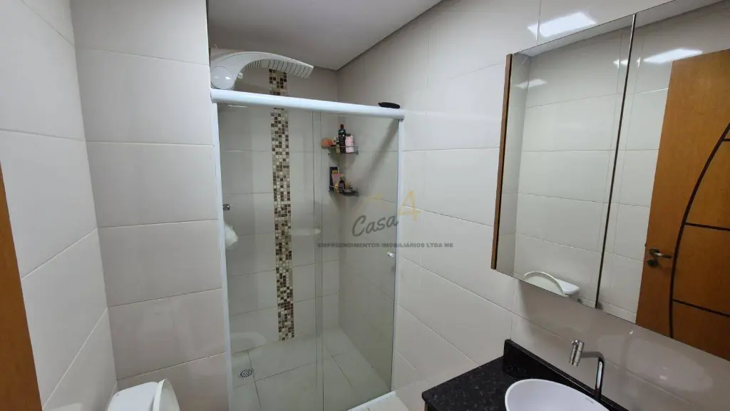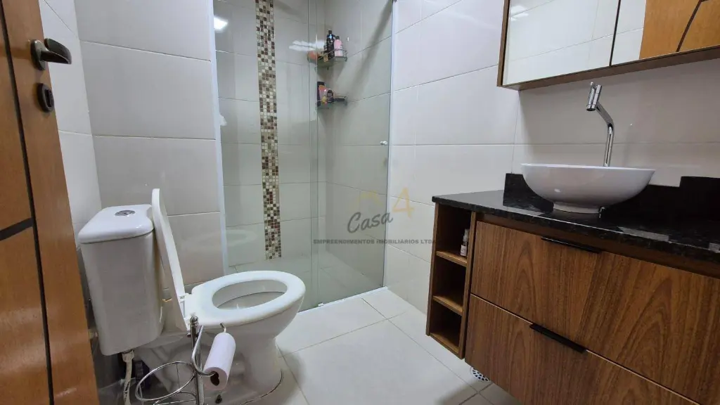 Banheiro com box de vidro e gabinete