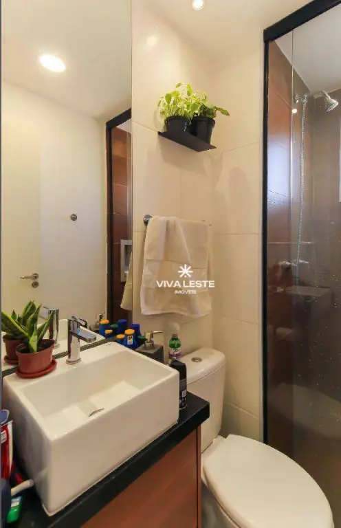 - Banheiro social completo, com armário planejado e box de vidro.
