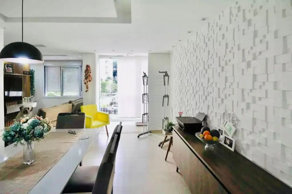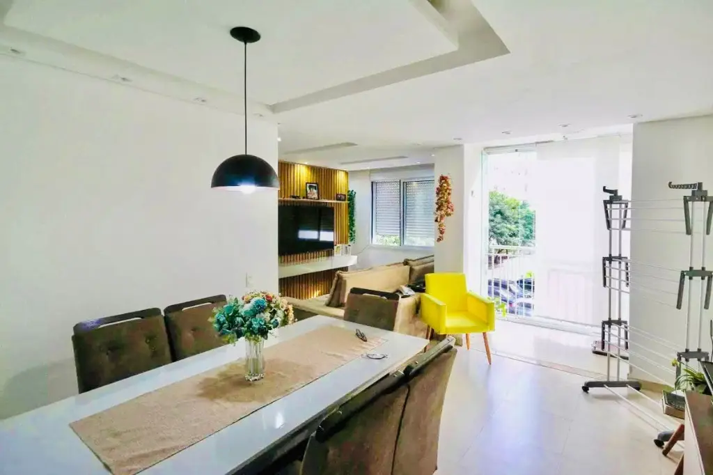 Apartamento com 60 metros privativos distribuídos em 2 dormitórios sendo 1 suíte, banheiro social, ambos com iluminação e ventilação natural, sala ampliada com 3 ambientes (estar/tv/jantar), varanda integrada com o living e com opção de churrasqueira elétrica ou à carvão ecológica, cozinha americana e área de serviço.