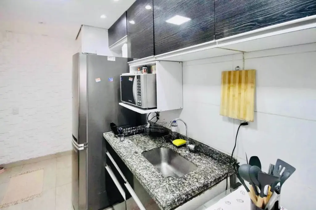 - Cozinha com bancada em pedra de granito, cuba de inox, torneira, gabinete e móveis planejados.