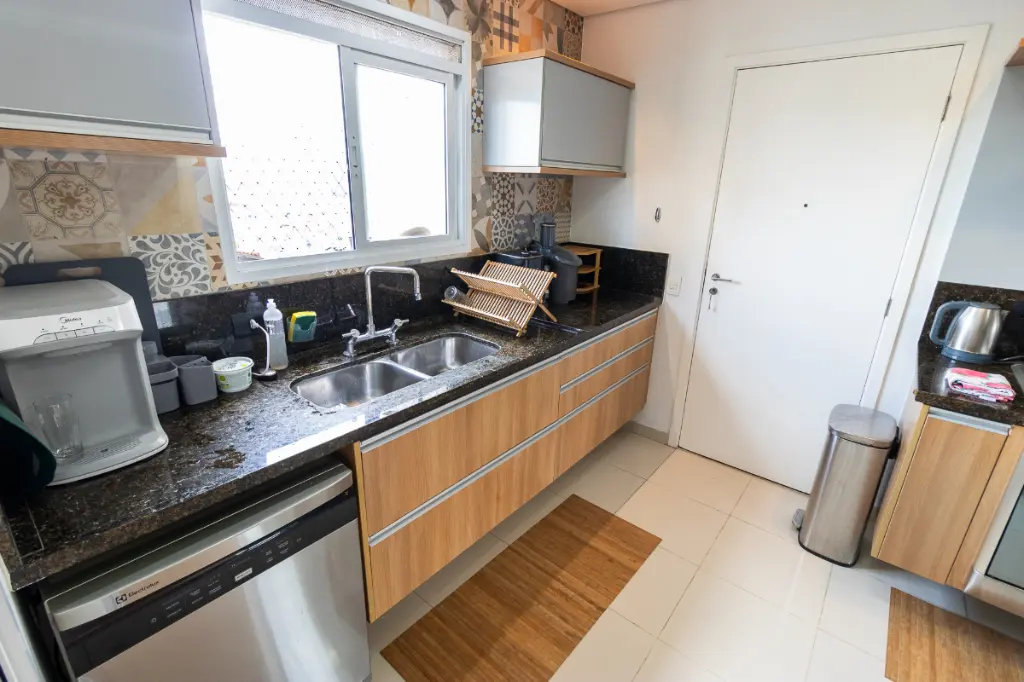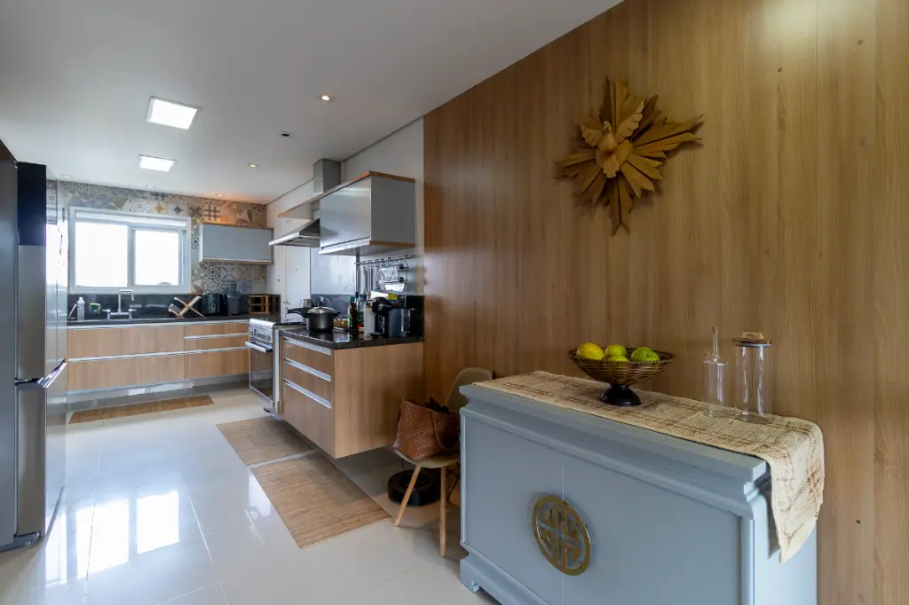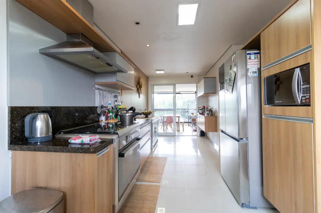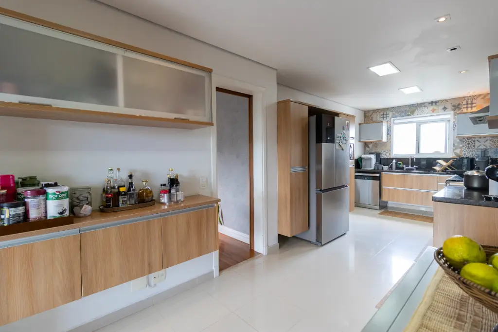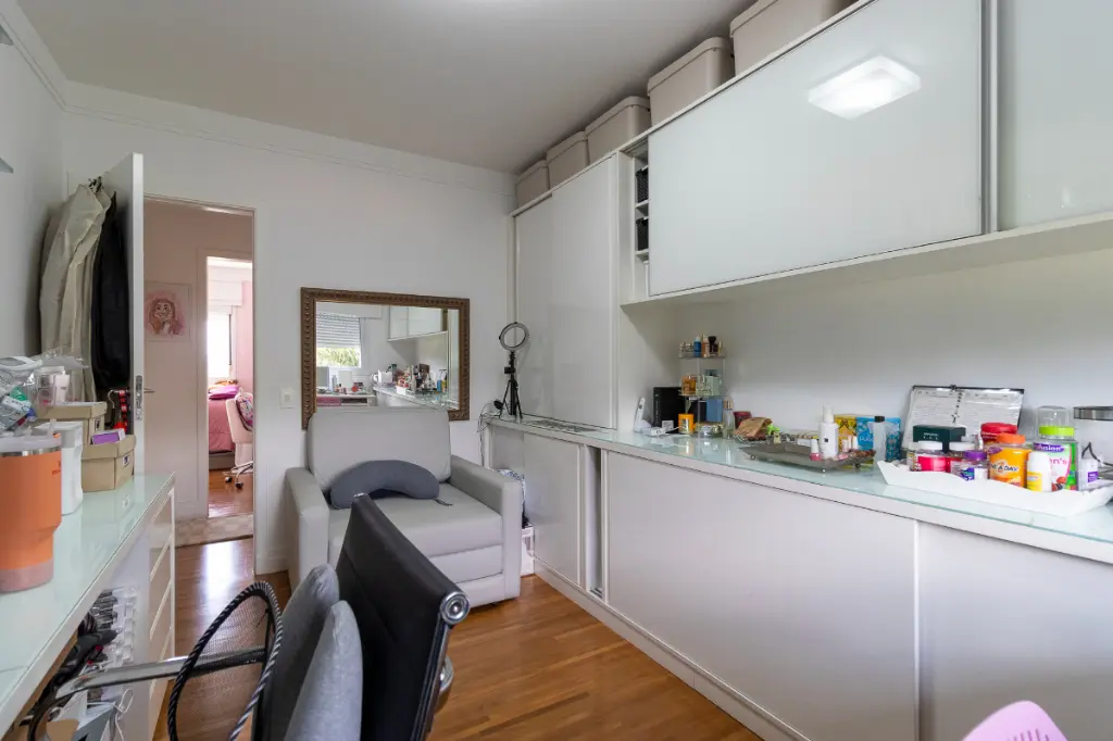 A unidade conta com ampla area de serviços, com despensa, quarto e banheiro de empregada.