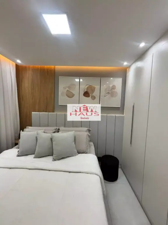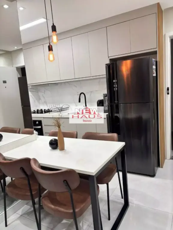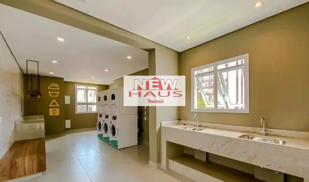 Acabamento com piso em porcelanato, pedras da cozinha, lavanderia e banheiro em quartzo branco; parede da sala de espelho, iluminação com luzes brancas e led amarelo.