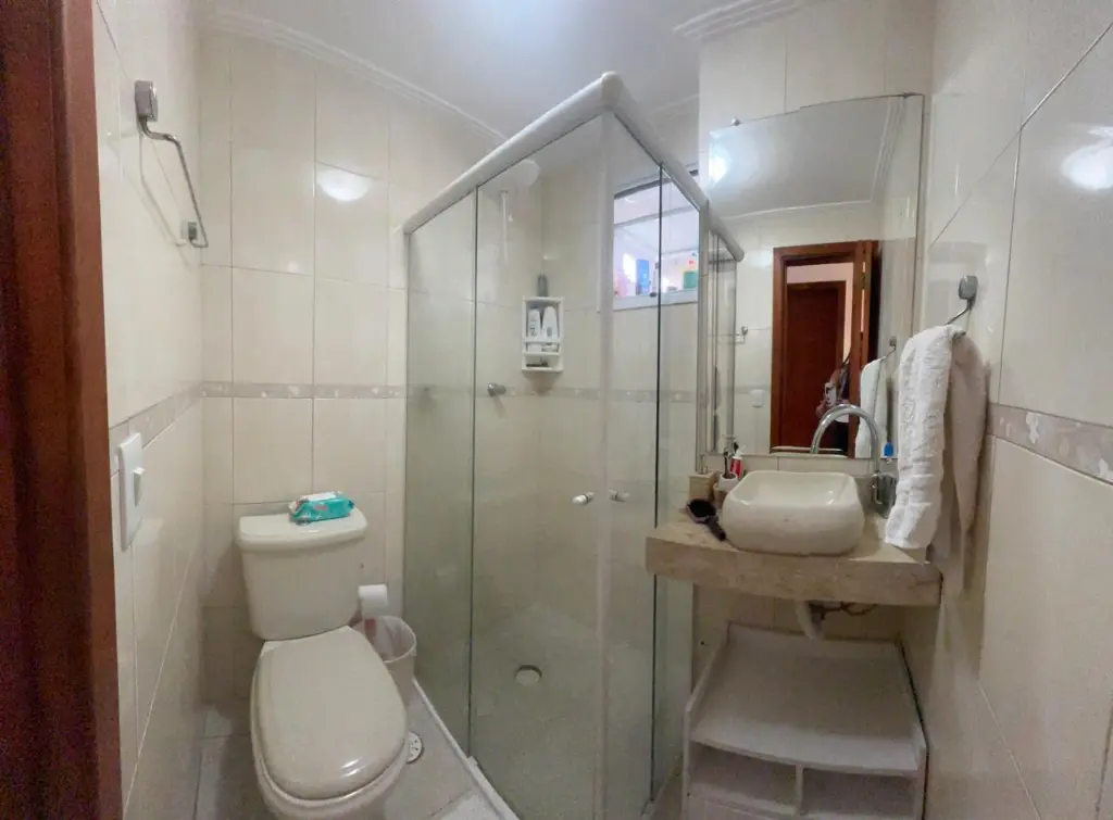 - Banheiro com BOX, espelho e armário móvel.