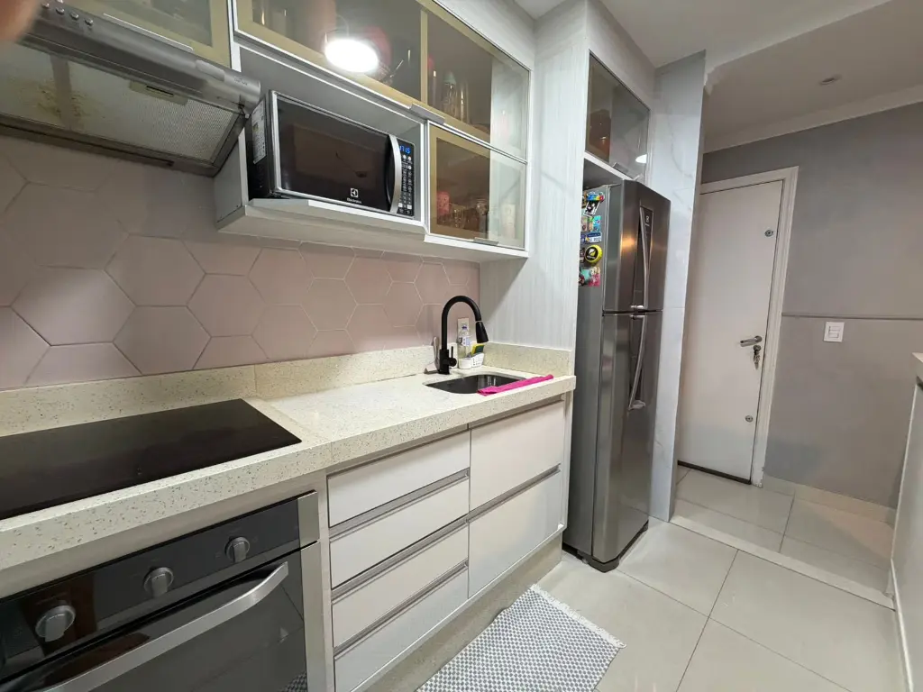 Cozinha com armários planejados, cooktop e forno