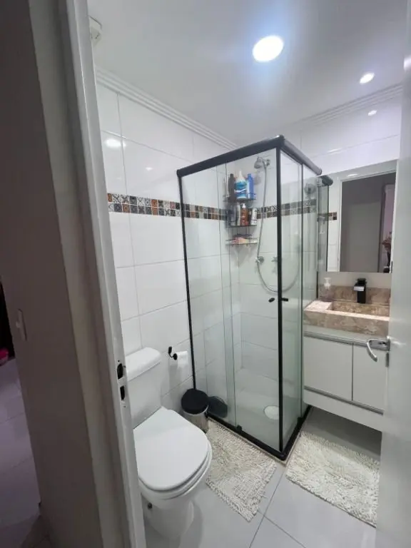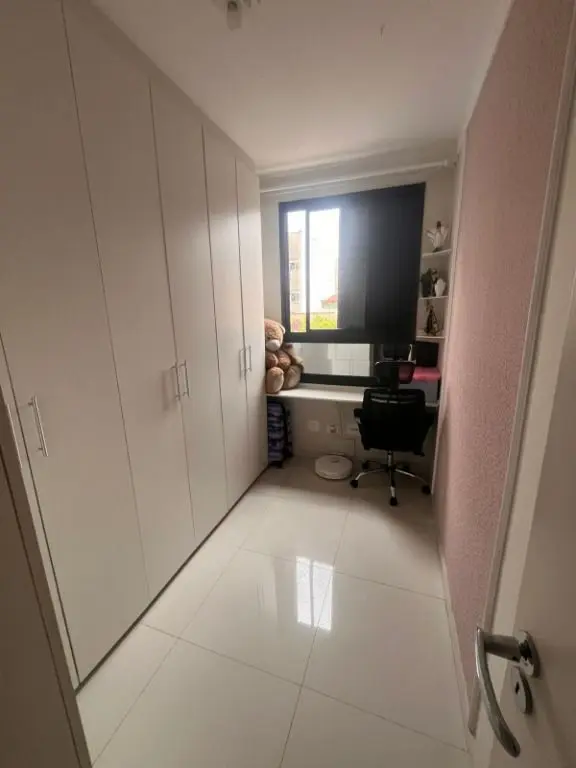 Sala em porcelanato com espelho, sacada com fechamento em vidro, vista para o fundo, cozinha com armários planejados, cook top, depurador de ar, pastilhas, tipo americana com integração com a sala, banheiros com box de vidro, pia em mármores, gabinetes, espelhos, área de serviço com armários e aquecedor a gás. quartos com armários.