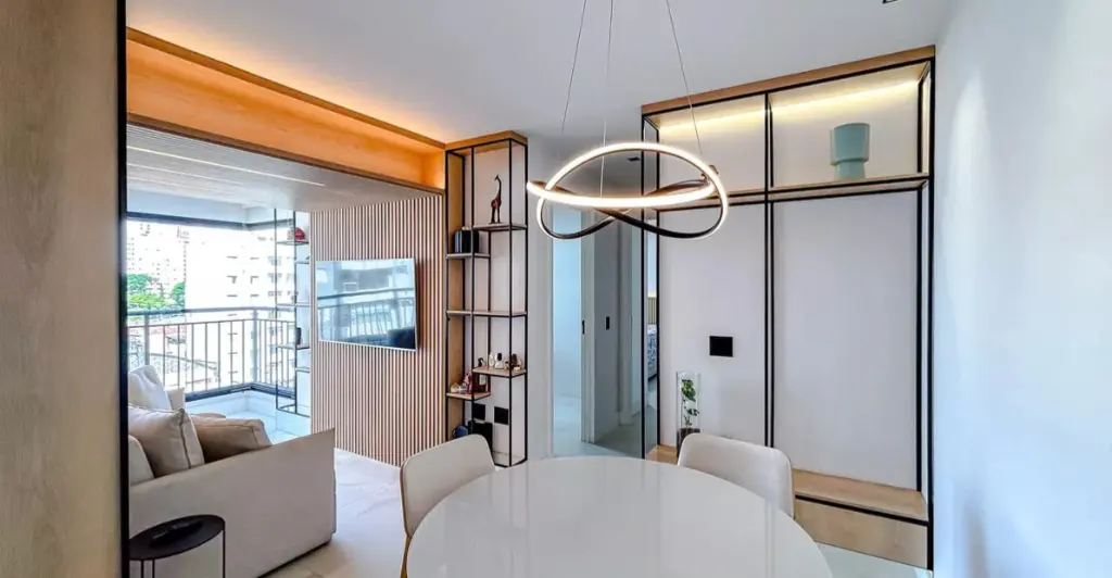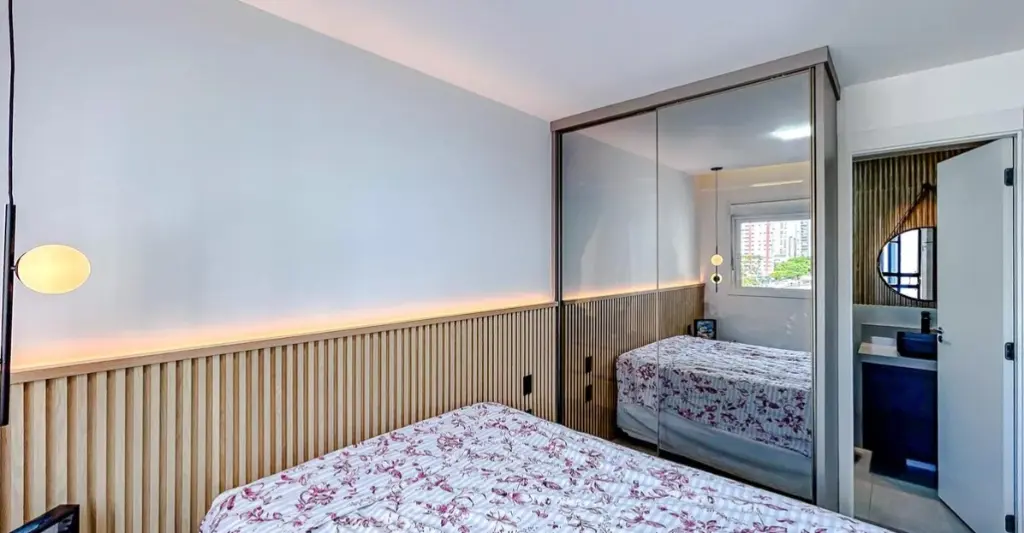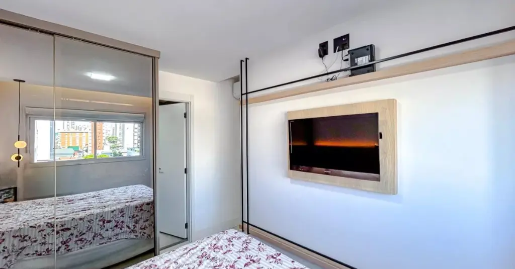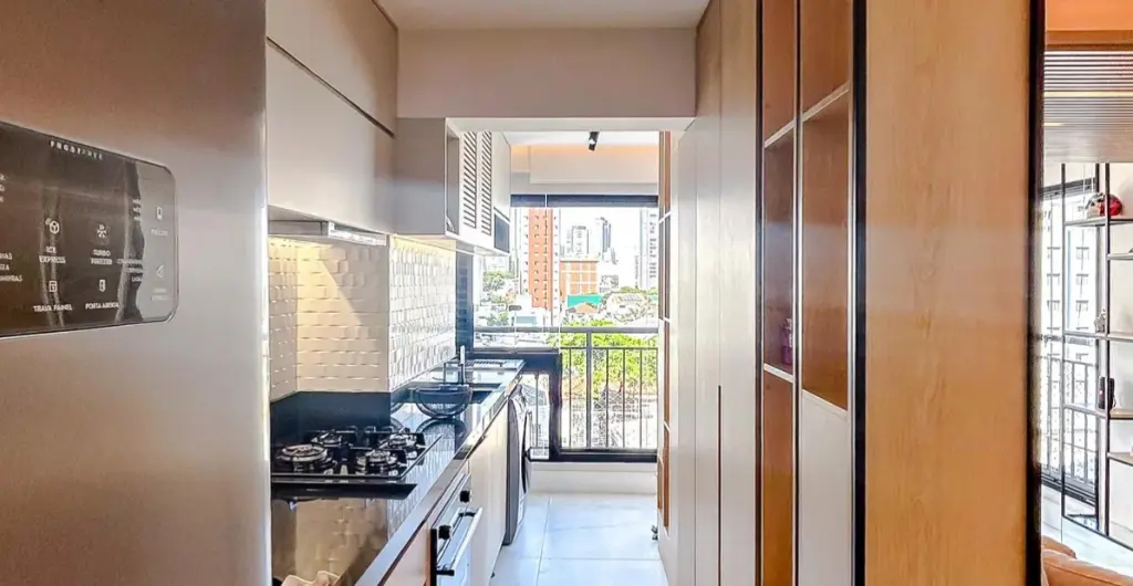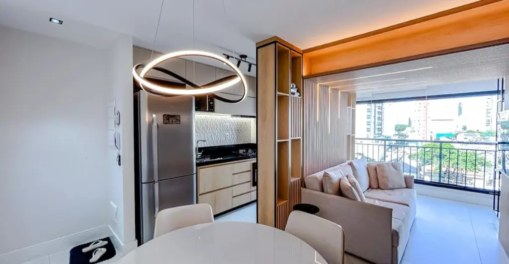 A planta de dois dormitórios inclui uma suíte privativa, oferecendo o espaço necessário para o descanso e a organização do dia a dia. A área social é integrada e bem iluminada, conectando-se a uma cozinha funcional e equipada. O imóvel conta ainda com uma vaga de garagem garantida.