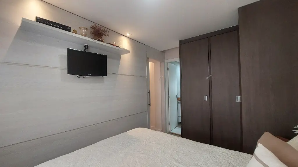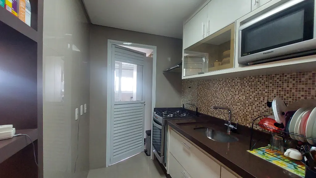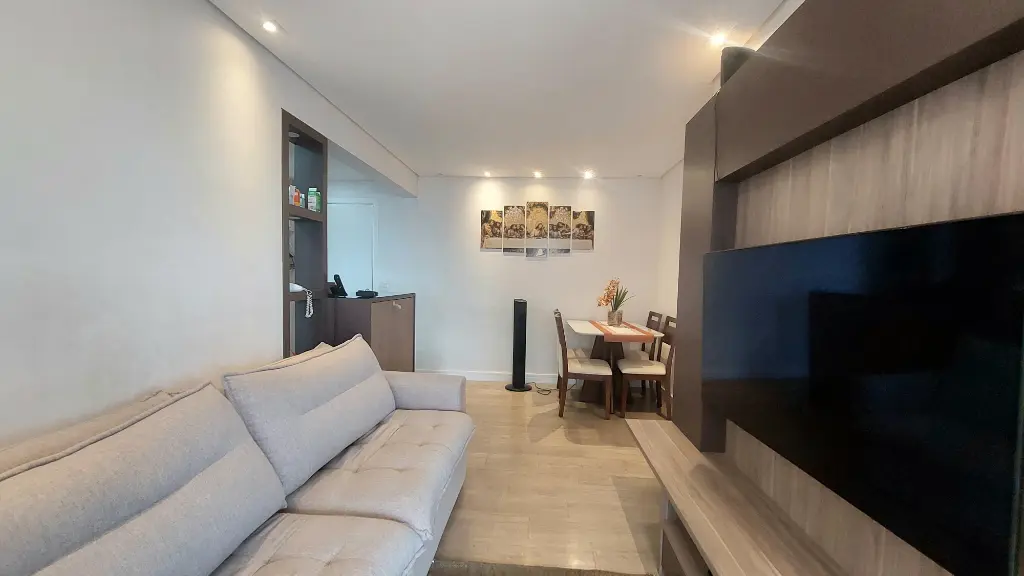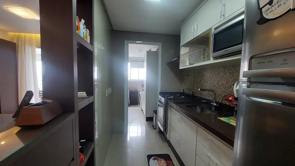 O apartamento conta com dois dormitórios, sendo uma suíte, todos com móveis planejados. A sala ampla para dois ambientes é perfeita para receber amigos e viver momentos especiais em família. A cozinha é totalmente planejada, funcional e bem distribuída, assim como a área de serviço. O imóvel está mobiliado, pronto para morar, com excelente aproveitamento de espaço e acabamentos de bom gosto. Os pisos em laminado trazem aconchego e elegância aos ambientes.