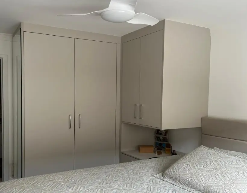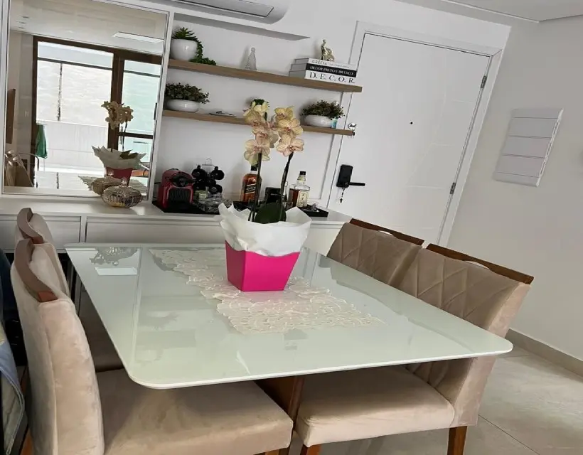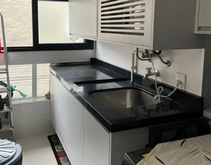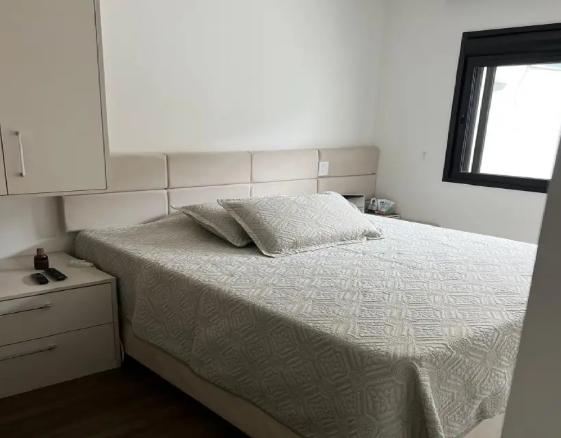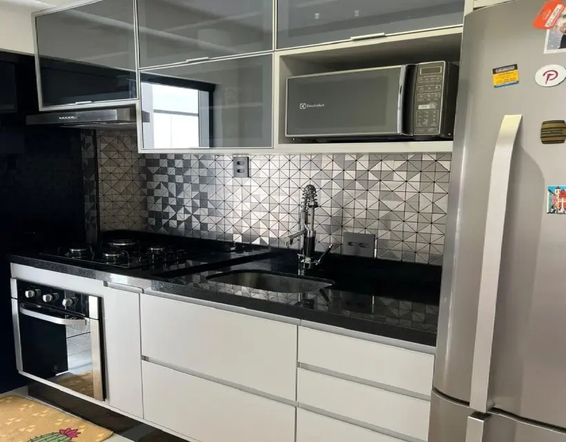 A área íntima conta com dois dormitórios, sendo uma suíte com móveis planejados e piso laminado, oferecendo praticidade e aconchego no dia a dia. A cozinha planejada otimiza o espaço e garante organização, enquanto a área de serviço é funcional e bem posicionada. O imóvel dispõe ainda de uma vaga de garagem para um veículo.
