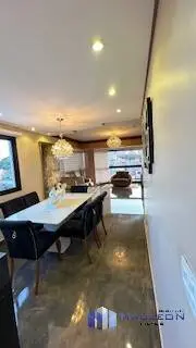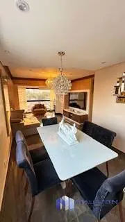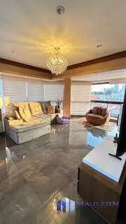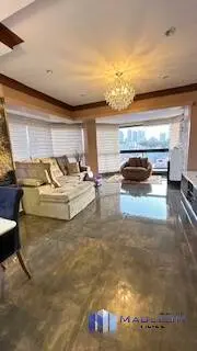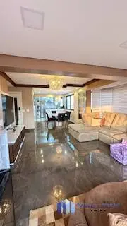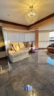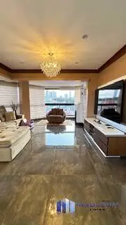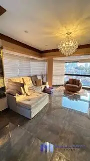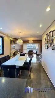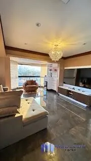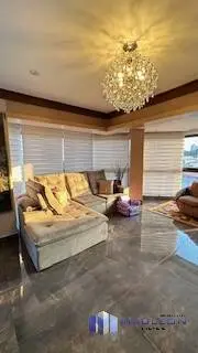 Elegante living para 3 ambientes, com piso de madeira, amplas janelas, lustres de cristal, e painel moderno com rack laqueado