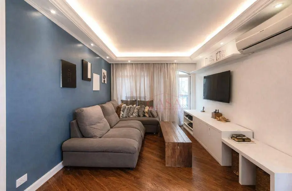 Sala de estar ampla, com excelente iluminação e acabamento moderno