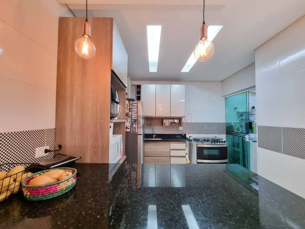 Cozinha americana com armários e ampla bancada em granito
