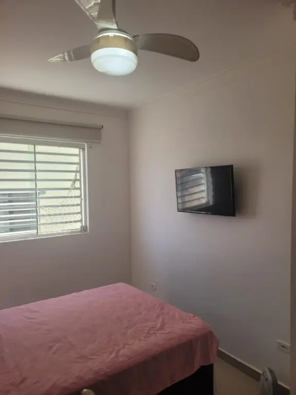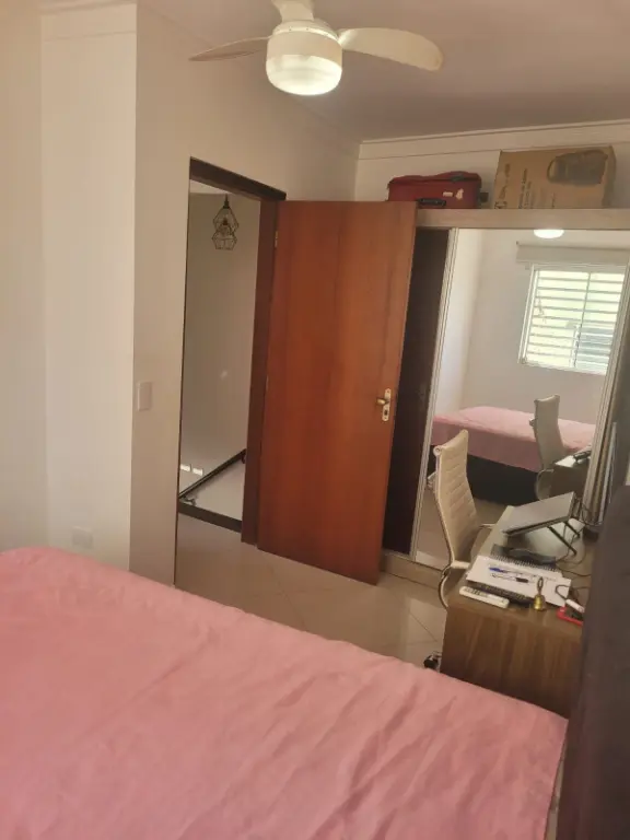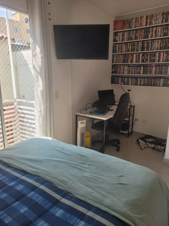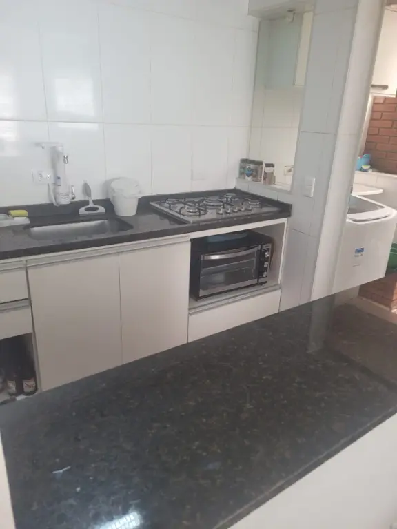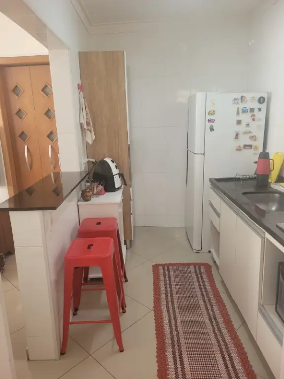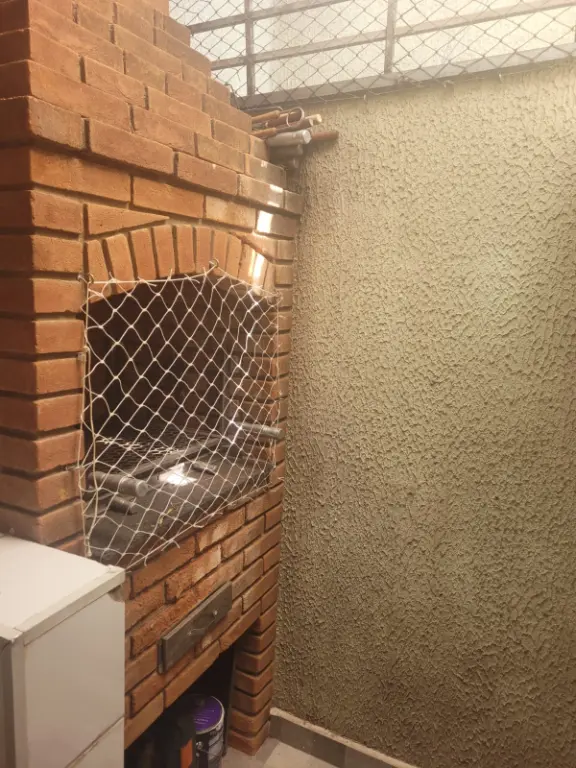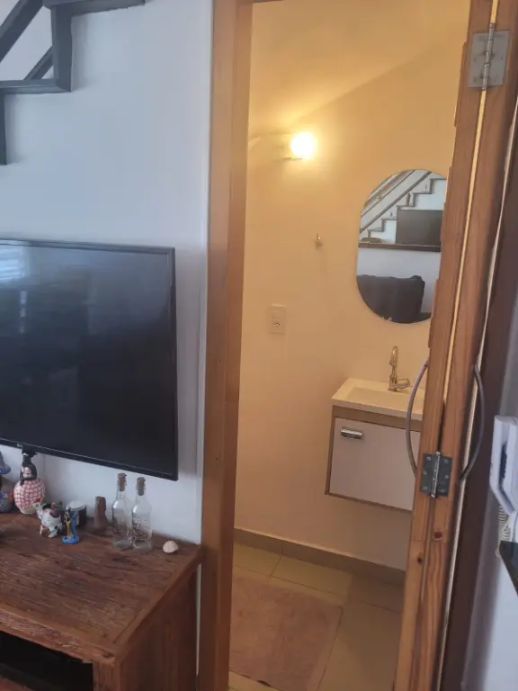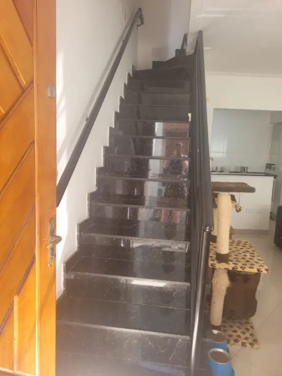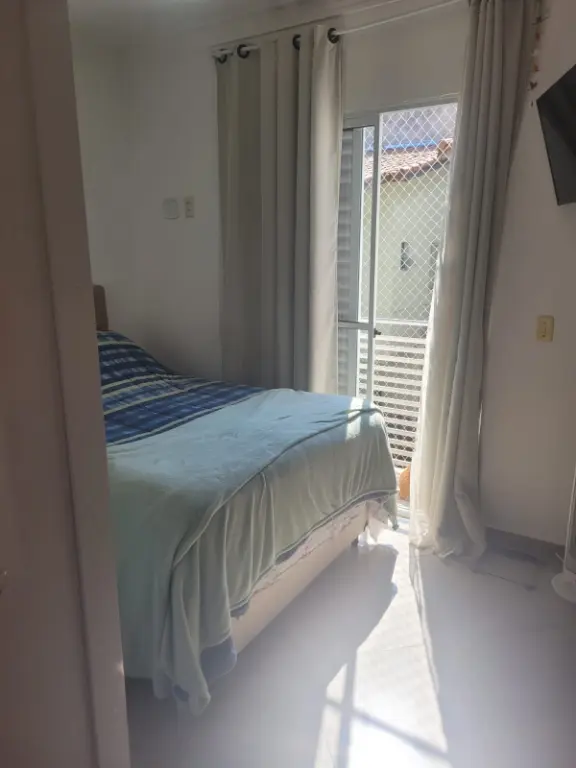 Sobrado em condomínio fechado, com sala, cozinha americana, dois quartos, um banheiro e um lavabo. Duas vagas na garagem e churrasqueira própria.