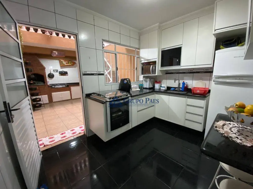 Reforma recenete, cozinha com móveis planejados e amplo quintal nos fundos com churrasqueira instalada
