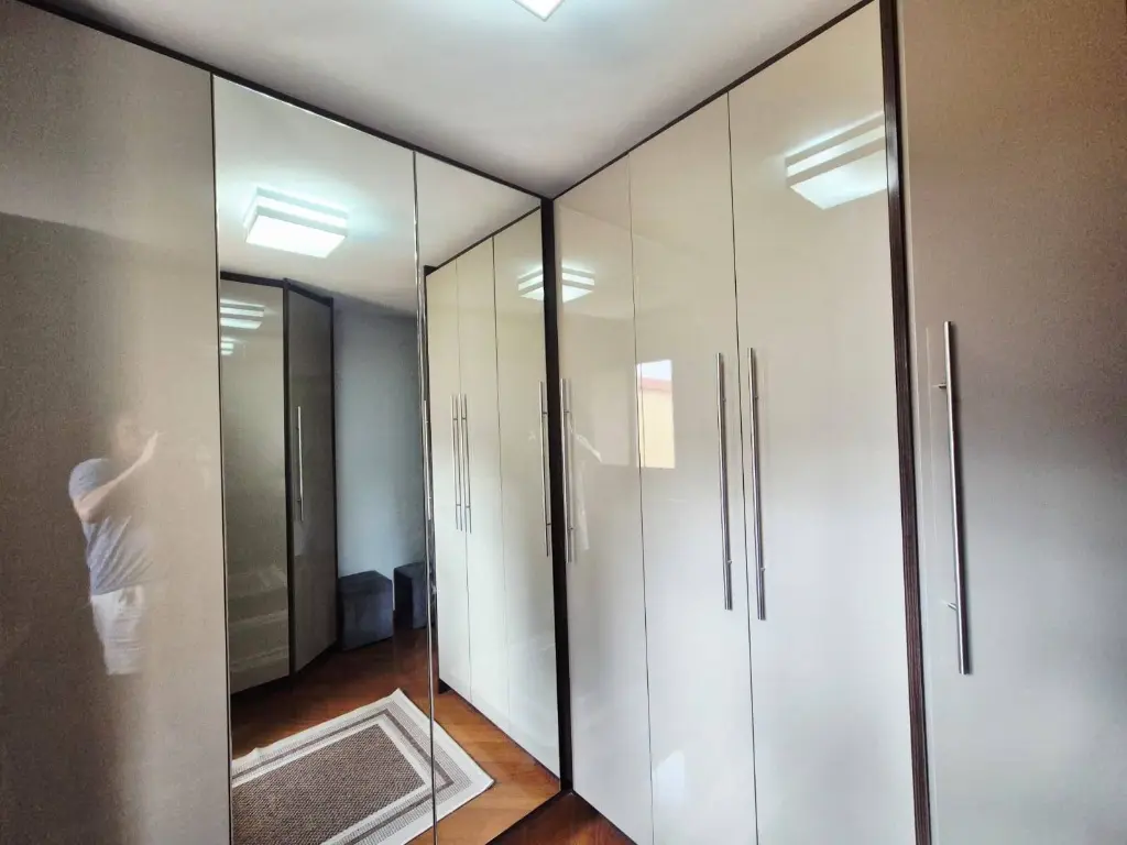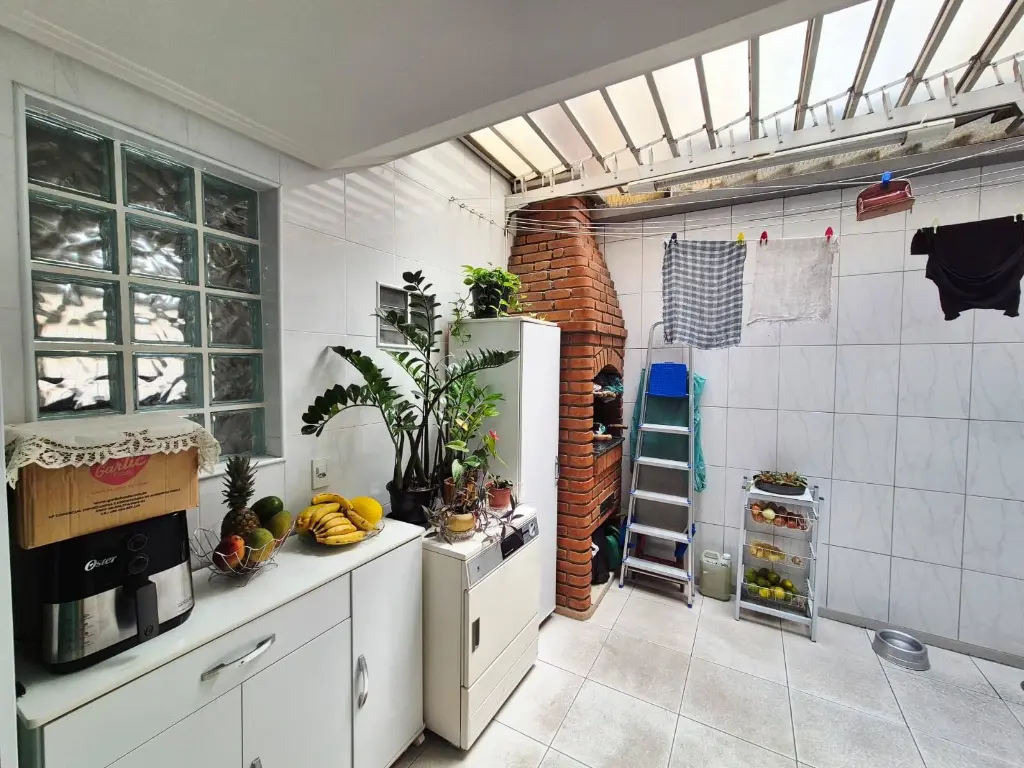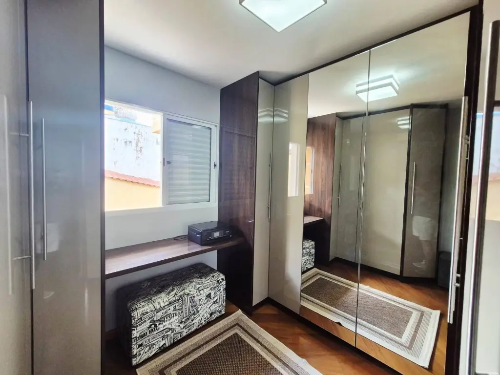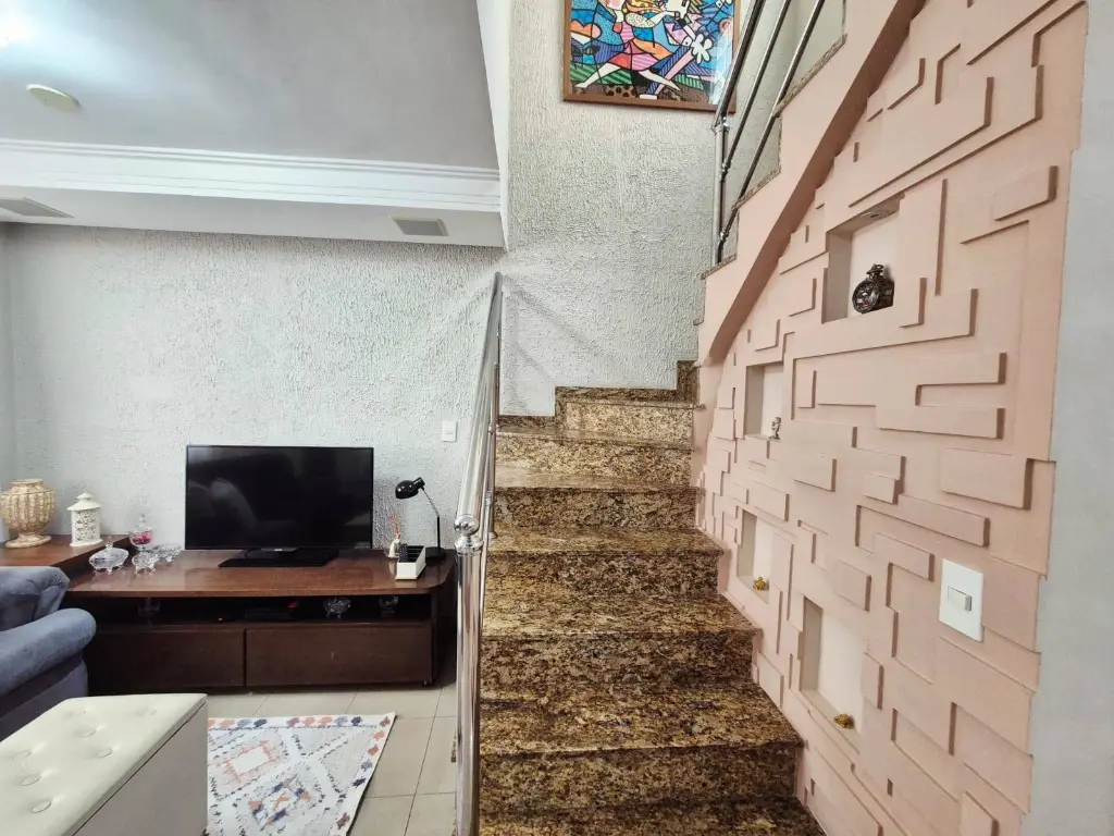 Sobrado em condomínio horizontal fechado com seis unidades, imóvel composto de sala para dois ambientes, lavabo, cozinha americana, lavanderia/quintal com churrasqueira, armários e zetaflex, duas suítes, um quarto (de vestir), lavabo, varanda, garagem coberta com 3 vagas demarcadas, pisos das salas e cozinha em porcelanato, pisos do quarto e suítes em carpete de madeira.